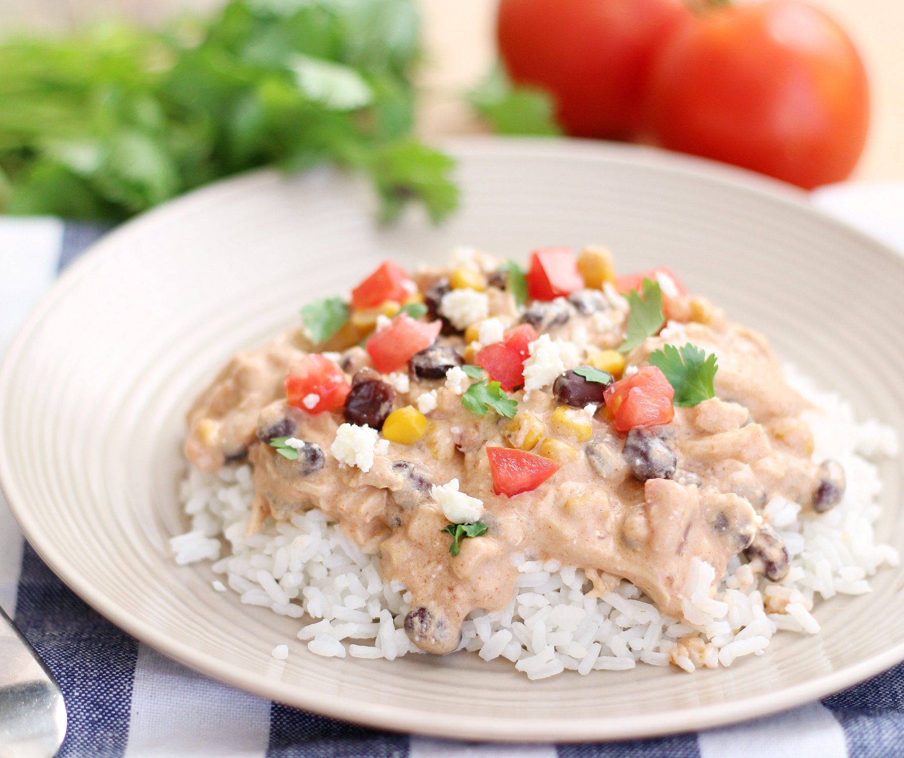 Chicken, beans, corn, salsa and cream cheese make up this amazing sauce to serve over rice.
