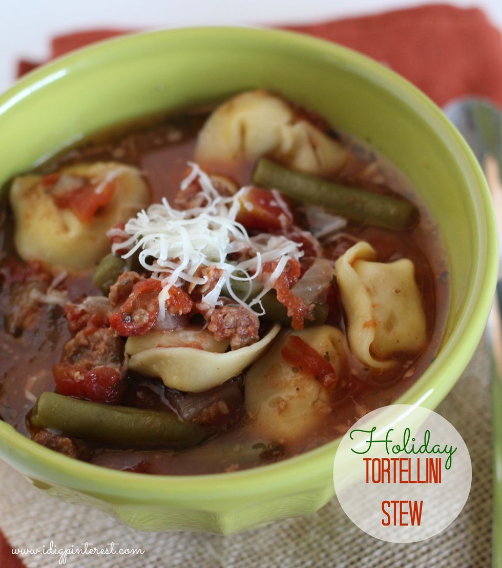 I have a wealth of soup recipes in my arsenal for frigid days like today, when I just want to put on an over-sized, comfy sweater, stay at home, and warm my innards with a bowl of hearty stew. This Italian sausage/tortellini concoction will do just that. The tomatoes and green beans give this dish a wonderful holiday appeal!