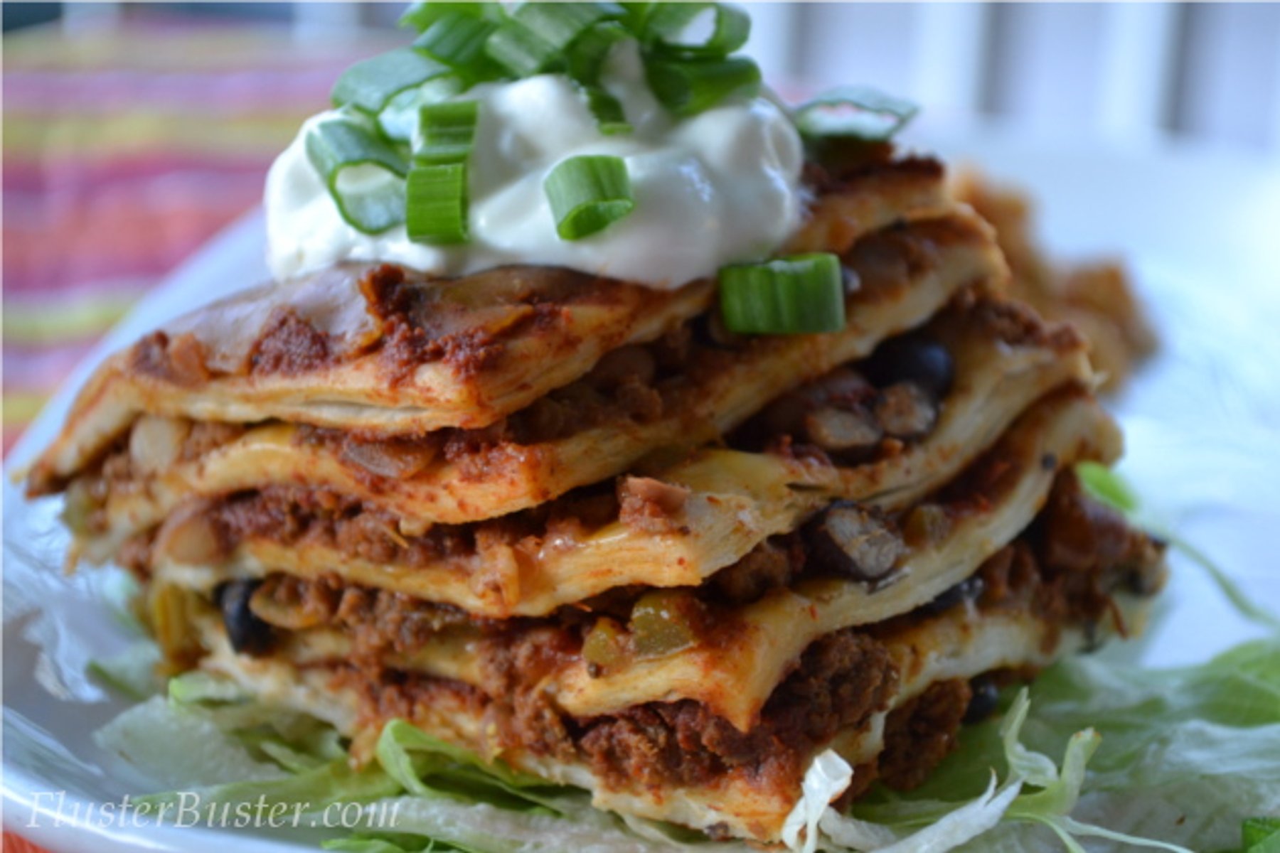 Mexican Slow Cooker Lasagna. This dish has the flavor of enchiladas with the look of lasagna. It's a hearty, flavorful dish that can be prepared a head of time in the slow cooker. This is a cheap recipe to prepare but you'd never know it by the amazing flavor it has. Serve with Mexican Rice and Mangoes (Feed 4 for $5.45)