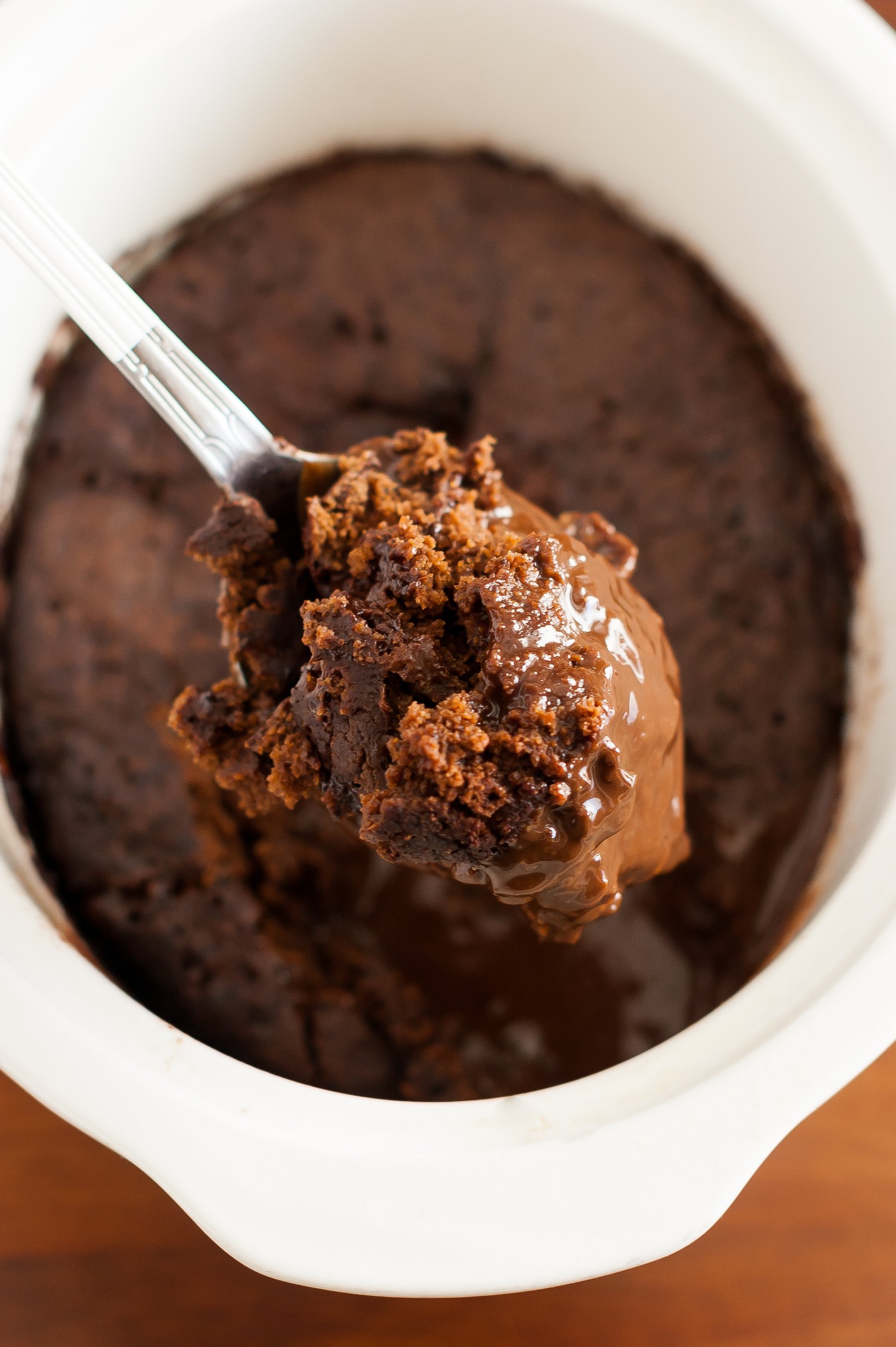 Grease the bowl of a slow cooker. In a mixing bowl, whisk together the flour, sugar, cocoa, baking powder, and salt. Add the coconut milk, butter, and vanilla to the bowl and whisk in until a smooth batter...