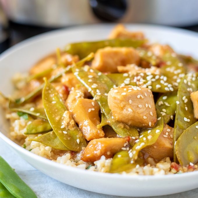 This Slow Cooker Mongolian Chicken is made with a naturally sweetened rich and spicy sauce and fresh snow peas for a delicious family meal.