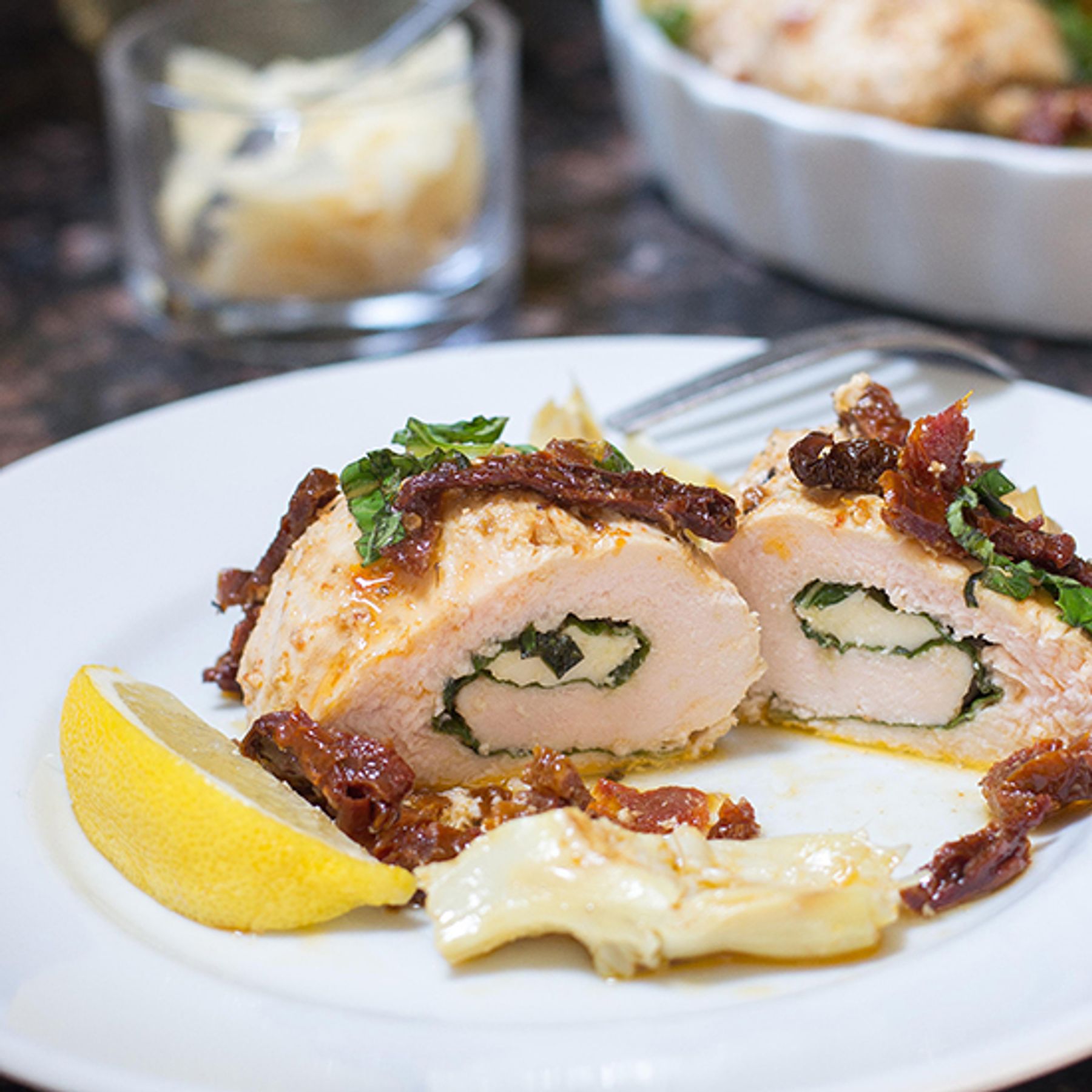 Using a fillet knife carefully slice each chicken breast through the middle to make 6 thin cutlets. Place them in a shallow casserole dish and empty the entire jar of sun-dried tomatoes on top. Let the...