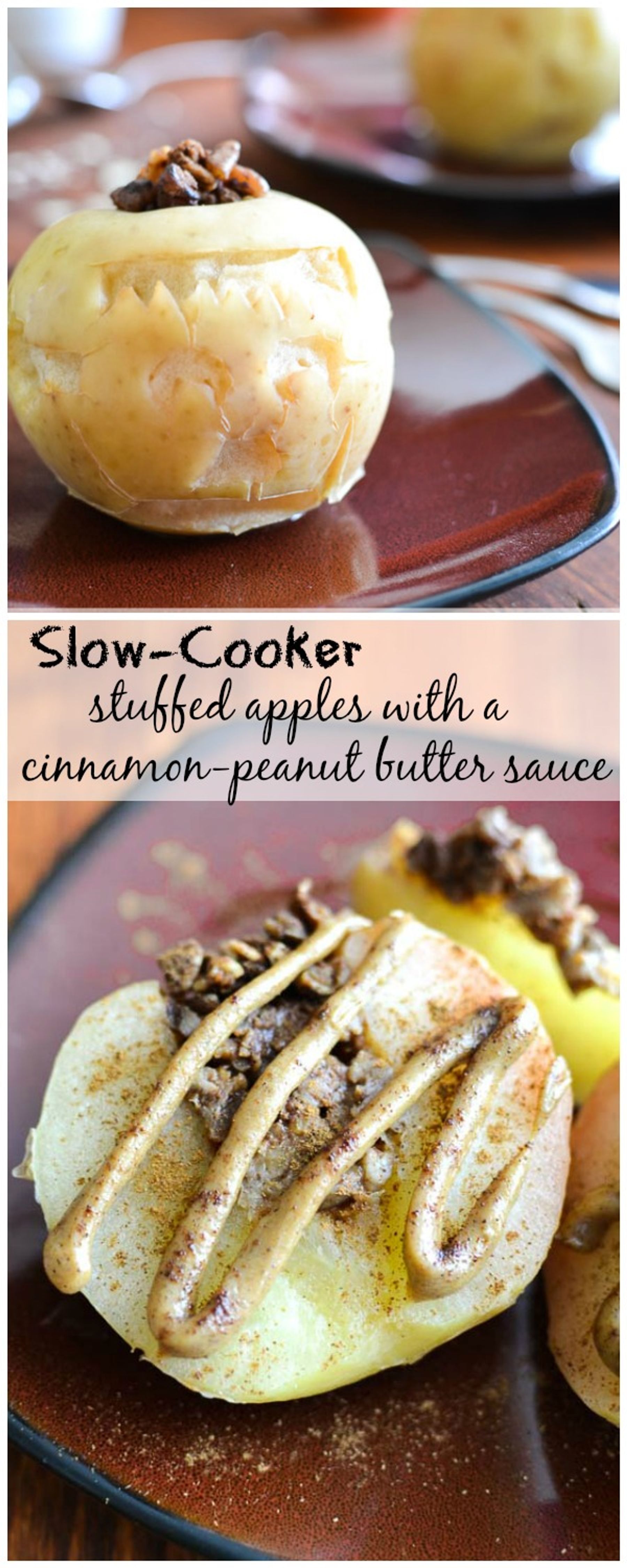 Slow Cooker Pecan-Stuffed Apples with Cinnamon-Peanut Butter Sauce