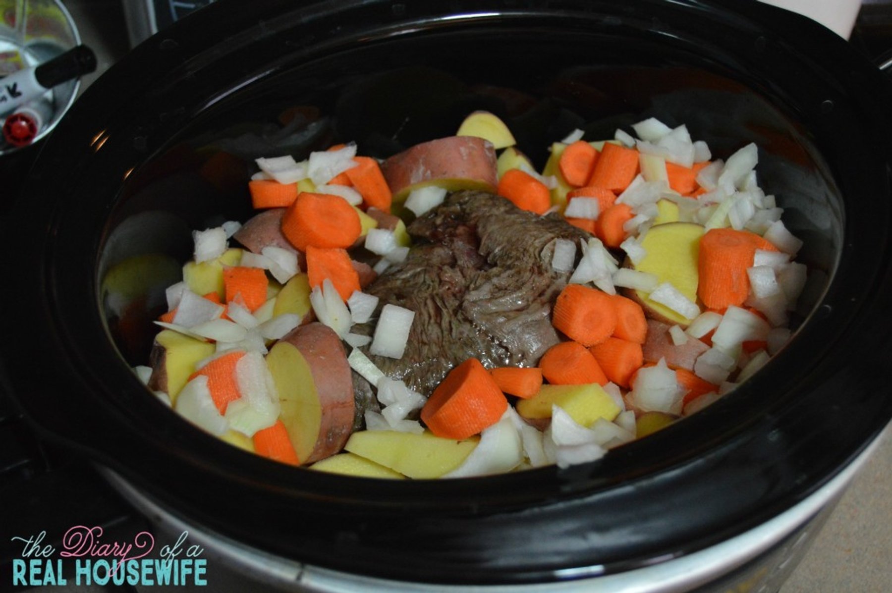 Place roast in the slow cooker and place potatoes, carrots, and onion around it.