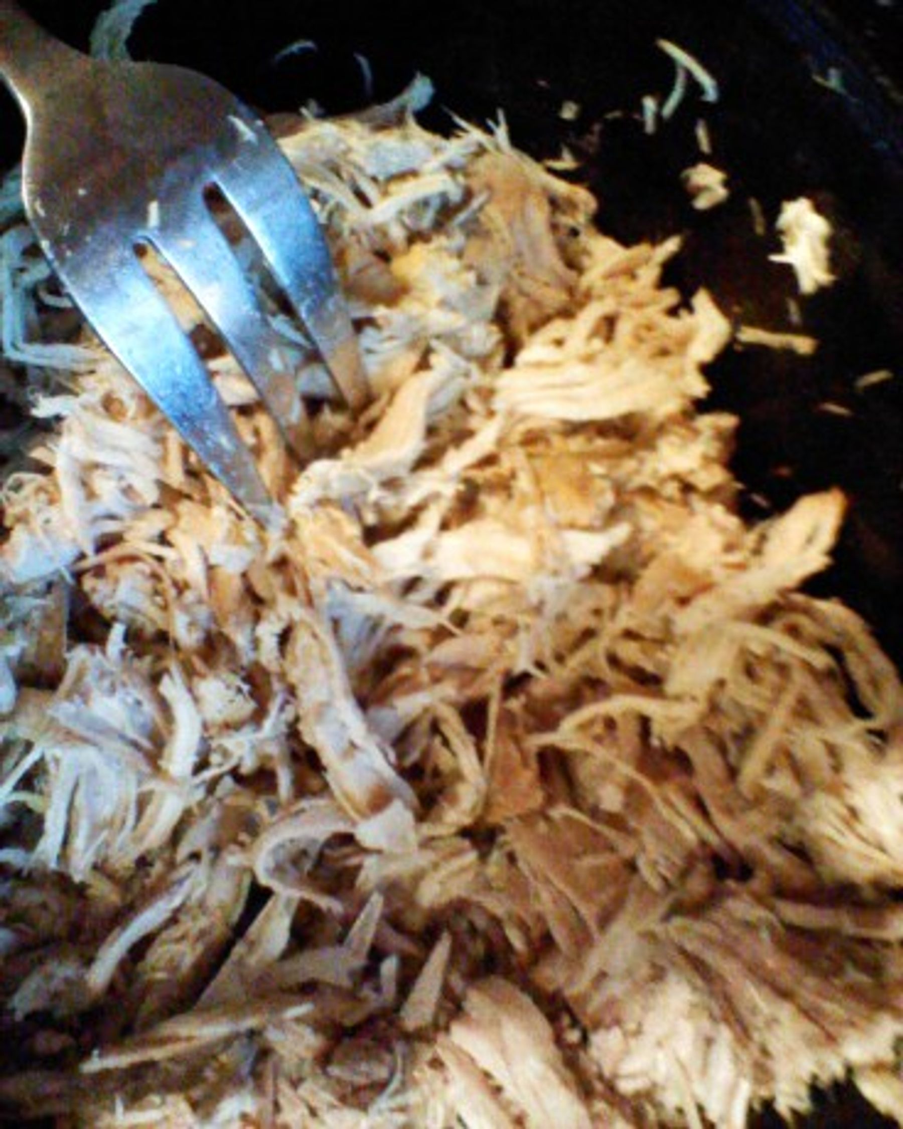 Pour the juices into a sauce pan and add 1/2 cup BBQ sauce (We use Sweet Baby Rays). Reduce by half. While this is reducing, use two forks to shred the meat....