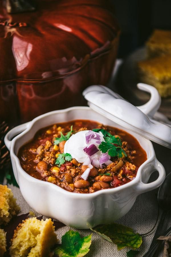 Nothing says "fall" quite like a cozy bowl of savory Pumpkin Chili! This healthy and easy dinner recipe is the perfect dish to serve on Halloween, but it's also a simple option for busy weeknights. Use ground turkey or ground beef, and prep a big batch on the stovetop or in the Crock Pot. Serve the turkey pumpkin chili is with cornbread, pumpkin muffins, or crunchy tortilla chips!