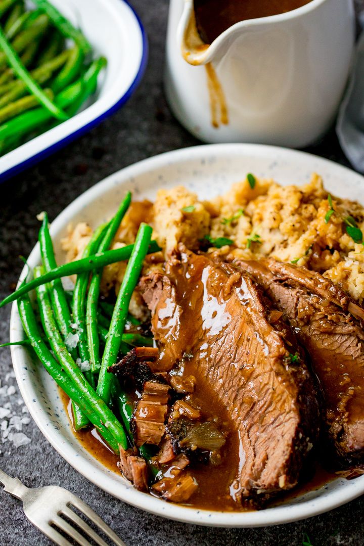 Slow Cooker Roast Beef Nicky CorbishleySeptember 20, 2019 50 Kitchen SanctuaryTender roast beef, mashed potatoes, vegetables and a rich meaty gravy – all made in your slow cooker. Warming comfort food bliss.Slow Cooker Roast BeefSee the full directions on my site