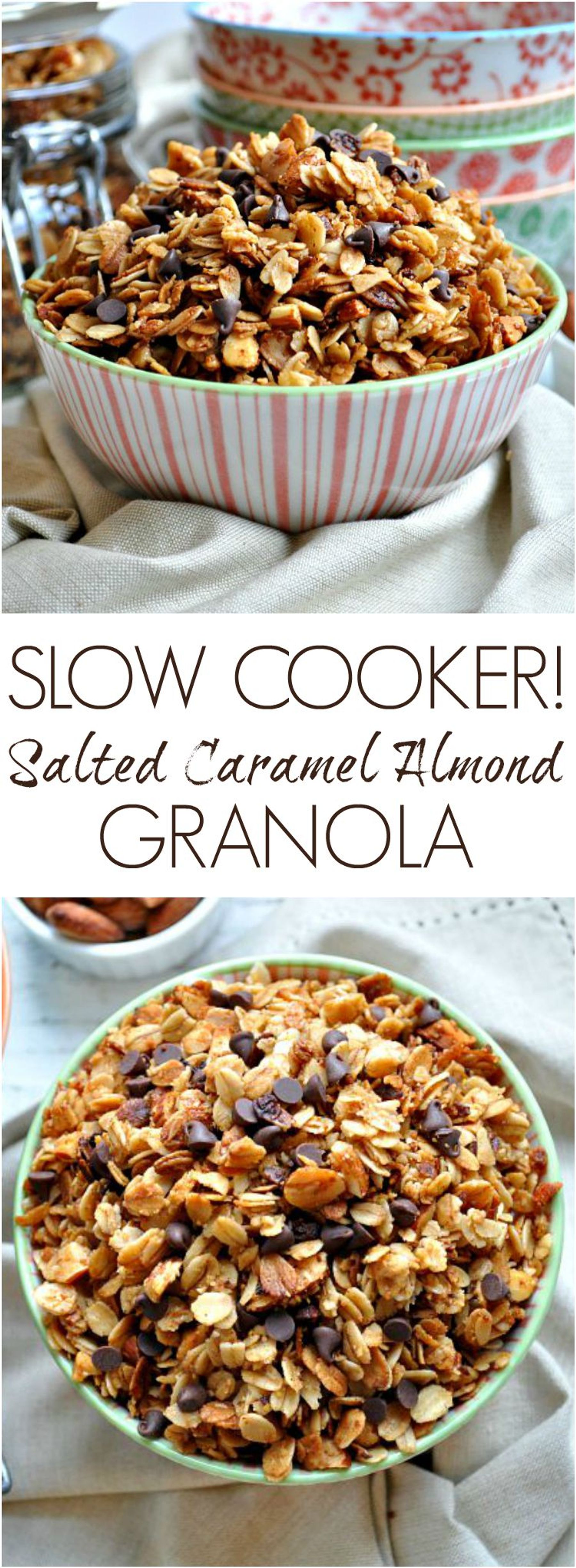 The sweet-and-salty flavor combination in this Slow Cooker Salted Caramel Almond Granola will leave you craving the crunchy treat for breakfast, snack, and dessert! It can be made vegan, dairy-free, and gluten-free…and best of all it bakes slowly in your Crock Pot while you go about your busy life. This granola is the perfect make-ahead breakfast or snack option for Back-to-School season (or for any other time of year)!
