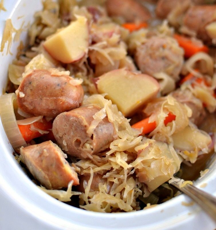 Slow Cooker Sauerkraut and Sausage is an easy family friendly meal combining smoked chicken or polish sausage, potatoes, carrots, onions and sauerkraut in a honey Dijon mustard base.