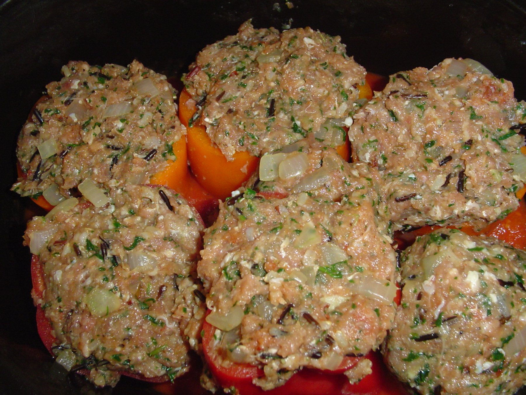 I found a recipe for stuffed peppers done in the slow cooker but the filling didn't thrill me. I decided to use the method but change the ingredients. I'm always looking for ways to sneak more nutrition into my main dishes but my kids(even the adult ones can be picky)aren't often receptive. Spinach packs a lot of bang for the buck but it's on the "I don't eat that!" list. I learned long ago that if I grind the offender up into tiny pieces there is no way it cou