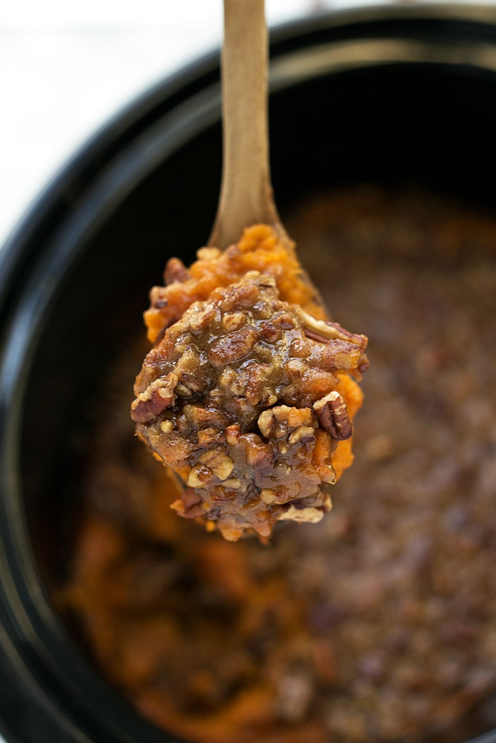 A delicious sweet potato casserole with pecans all made in the slow cooker, leaving you more oven space on Thanksgiving!