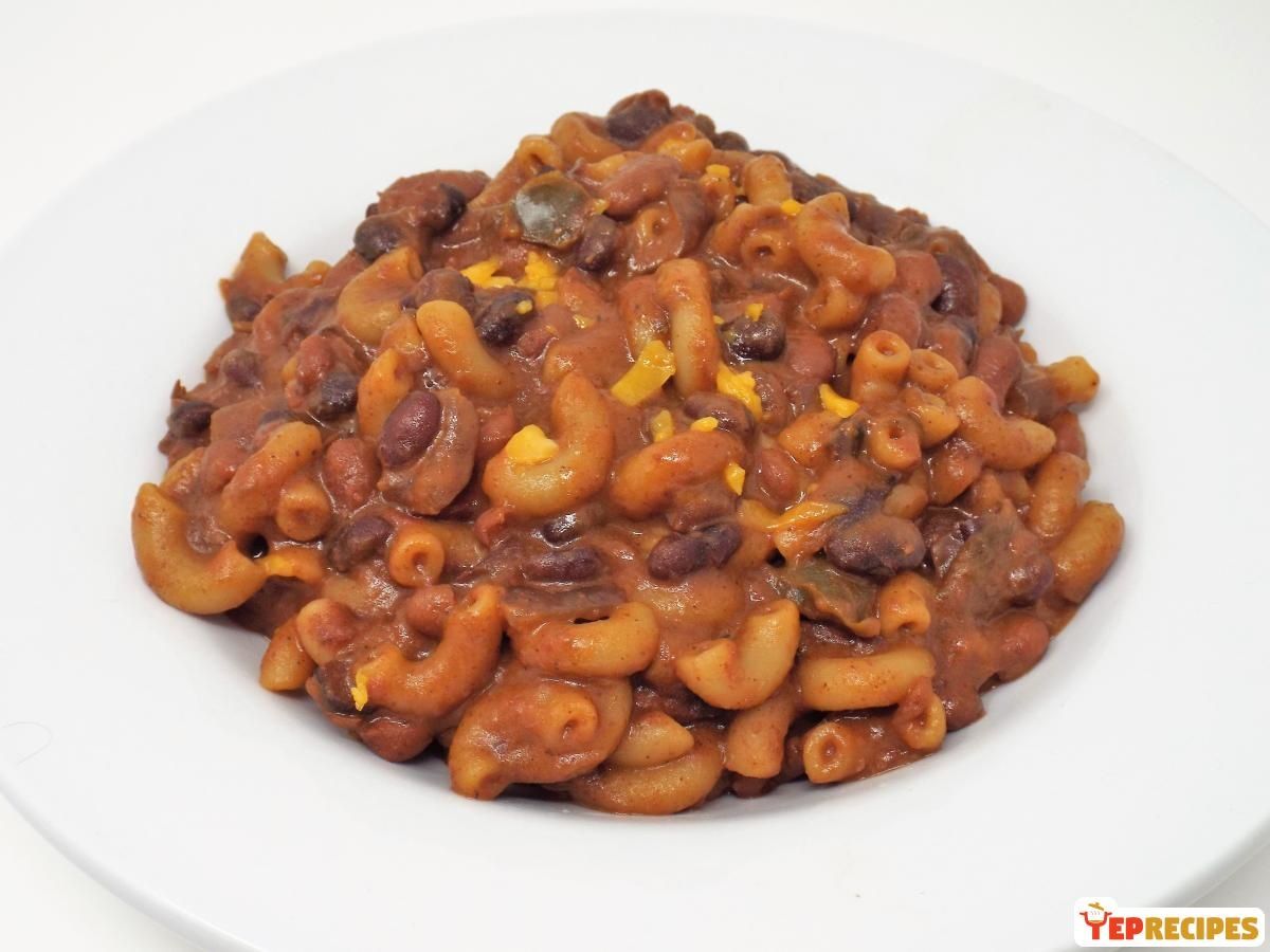 An easy cheesy vegetarian chili mac in your slow cooker made with black beans, pinto beans, vegetables, and spices.