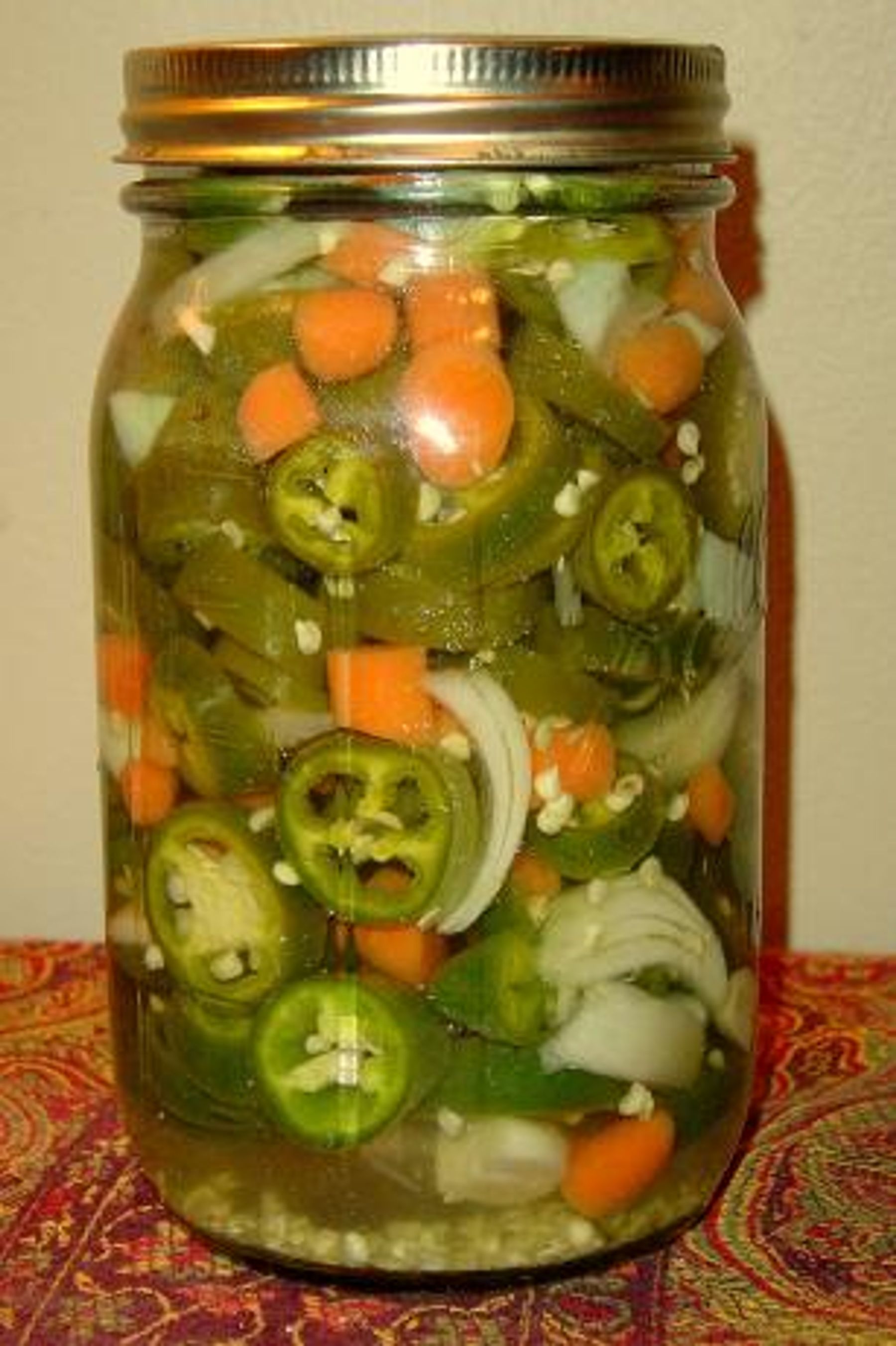 This makes one quart. Great for when you want to put together some jalapenos out of season. I don't use a water bath on this, since it's just one jar, but you could if you wished.