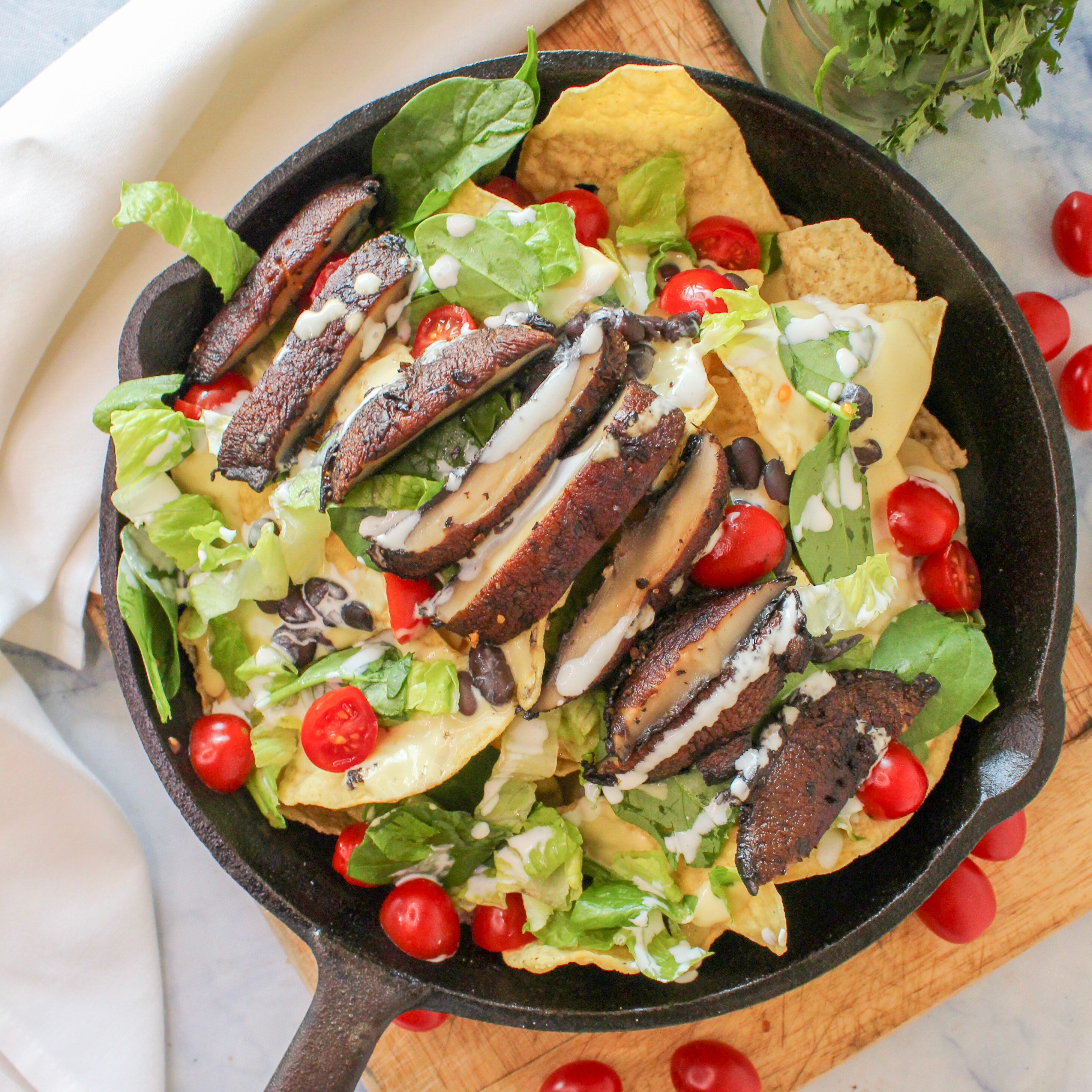 Vegan Smoked Gouda Steak Nachos. These are the perfect vegan party food. Blow your guests away with these flavor-full, delicious vegan nachos. Gluten free, dairy free and delicious. Topped with a mouth-watering marinated portobello mushroom steak.