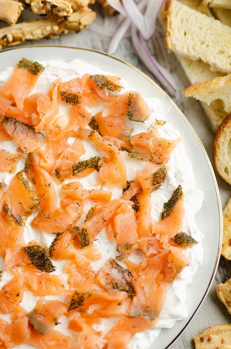 Smoked Salmon Cream Cheese Dip Danielle GreenJanuary 13, 2020 67 Smoked Salmon Cream Cheese Dip is an easy and impressive 5 ingredient appetizer recipe is made in only 5 minutes. A layer of whipped cream cheese and red onion is topped with cold smoked salmon and served with crackers and bread.try itSee the full directions on my site