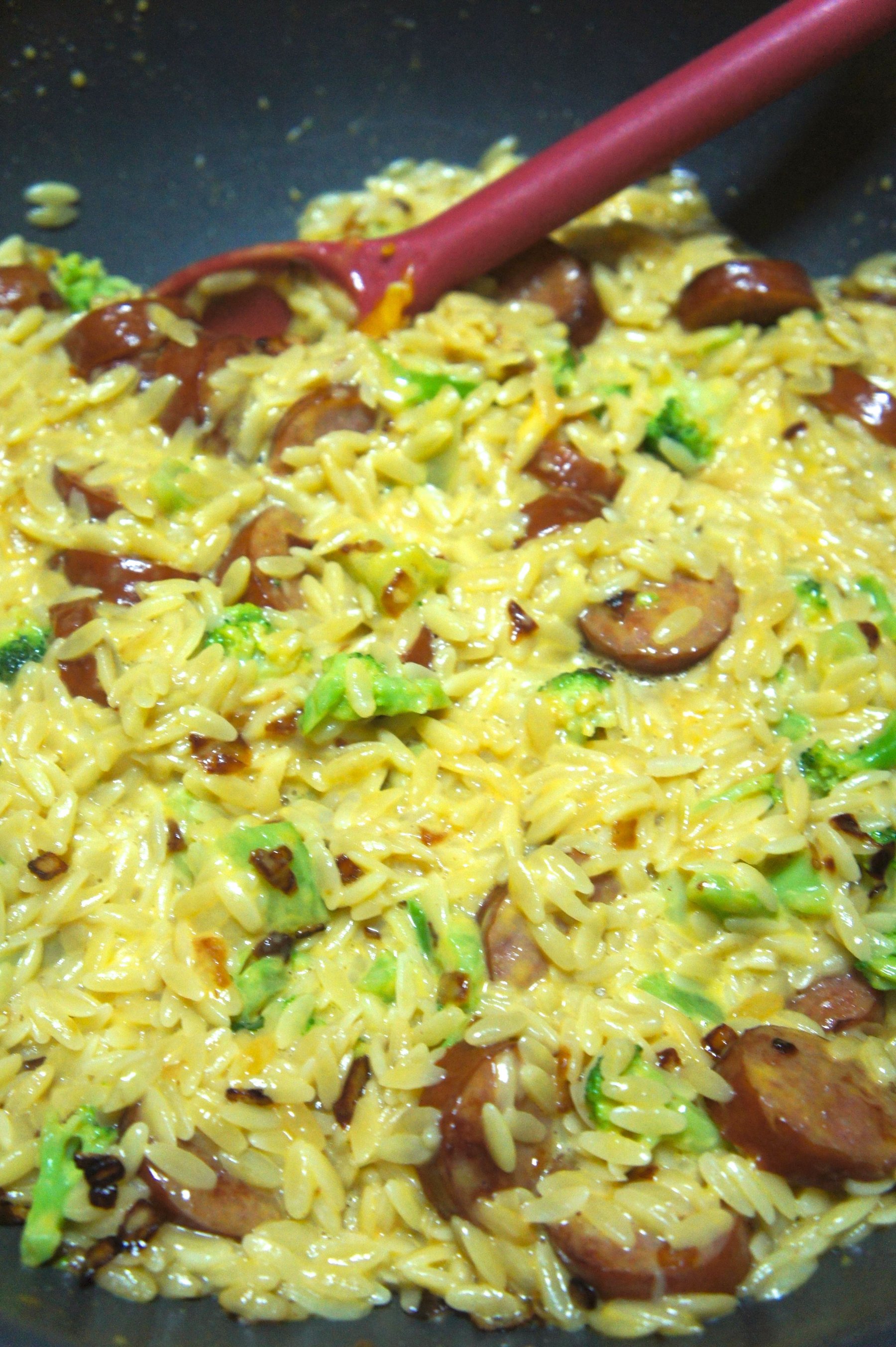 Orzo is combined with sausage, cheese and broccoli for a quick and easy dinner.