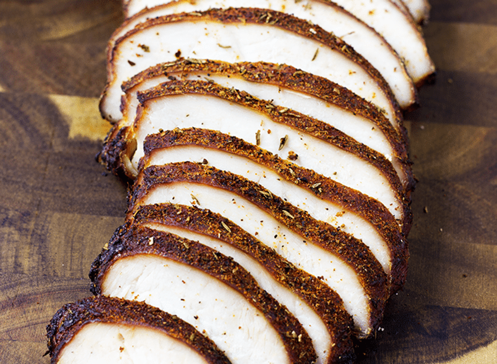 Season the turkey breast generously with the spice rub 1 hour before cooking.
