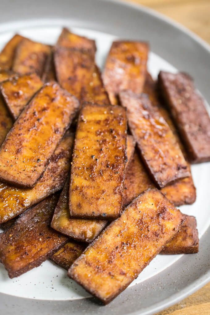 Drain the tofu. Leave the tofu to press while you prepare the other ingredients. Preheat the oven to 40 degrees F. Place a metal wrack on top of a baking sheet and lightly grease it. Whisk together the...