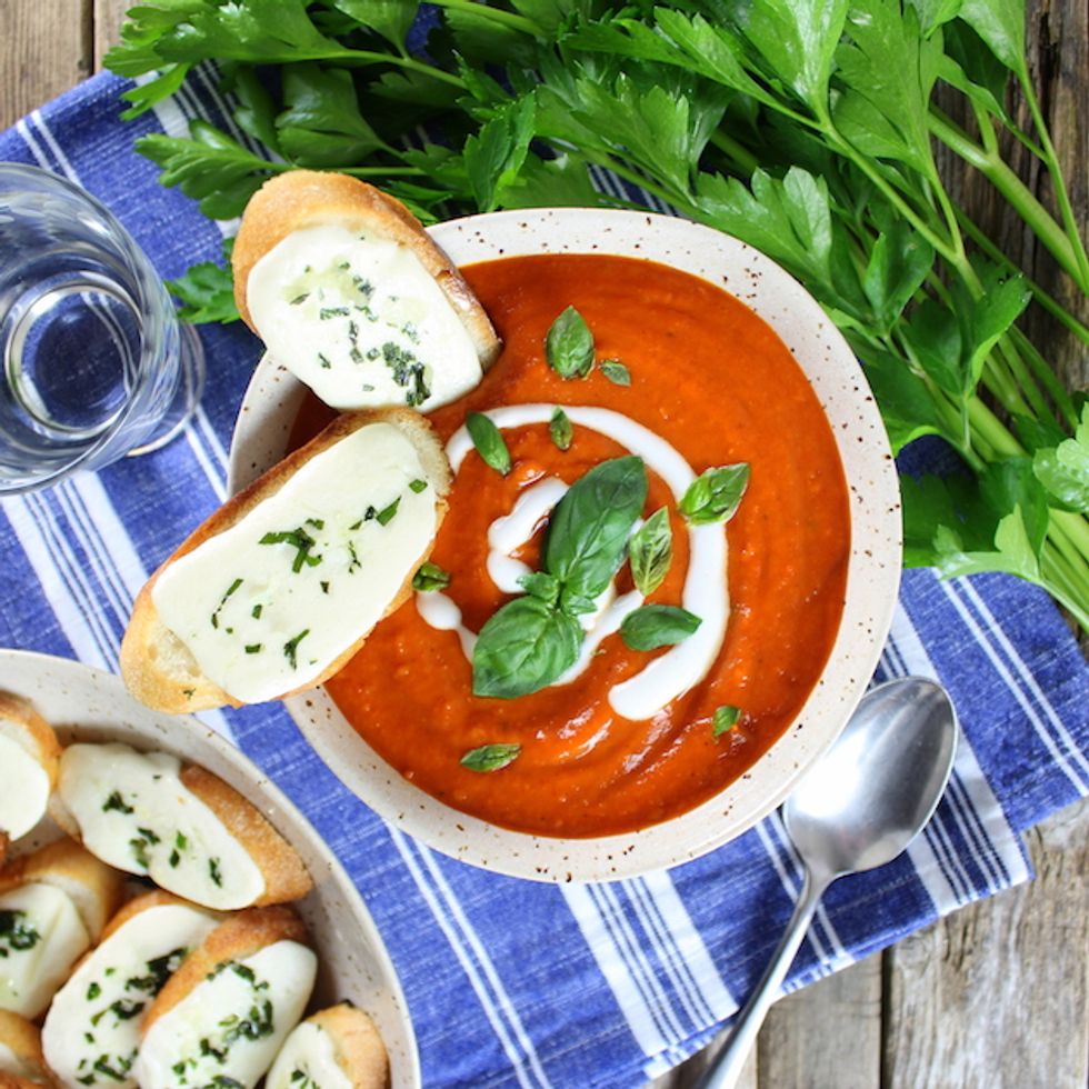 Smoky Harvest Tomato Soup with Mozzarella Crostini