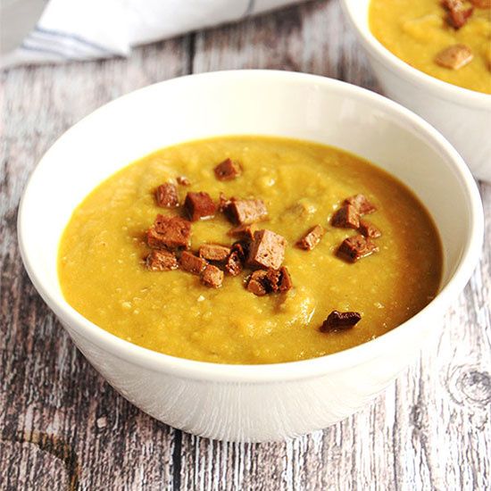 Smoky split pea soup with onions, carrots, celery and rosemary is made even more decadent with tofu bacon. The ultimate in healthy comfort food.