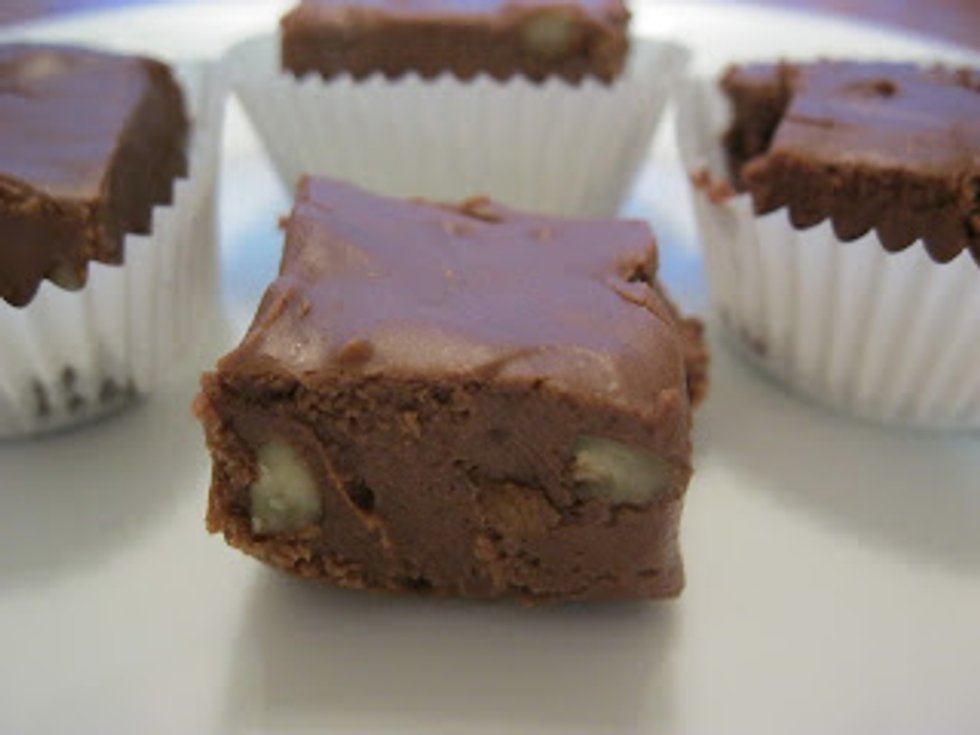 Fudge is one of those foods that I always associate with the Holidays. I picture my Grandma in the kitchen making wonderful things for the family. While this isn't a recipe she made requiring you to beat the fudge on a marble slab, it is still a hunk of smooth chocolate yumminess. If you are a chocolate purest, leave out the nuts :)