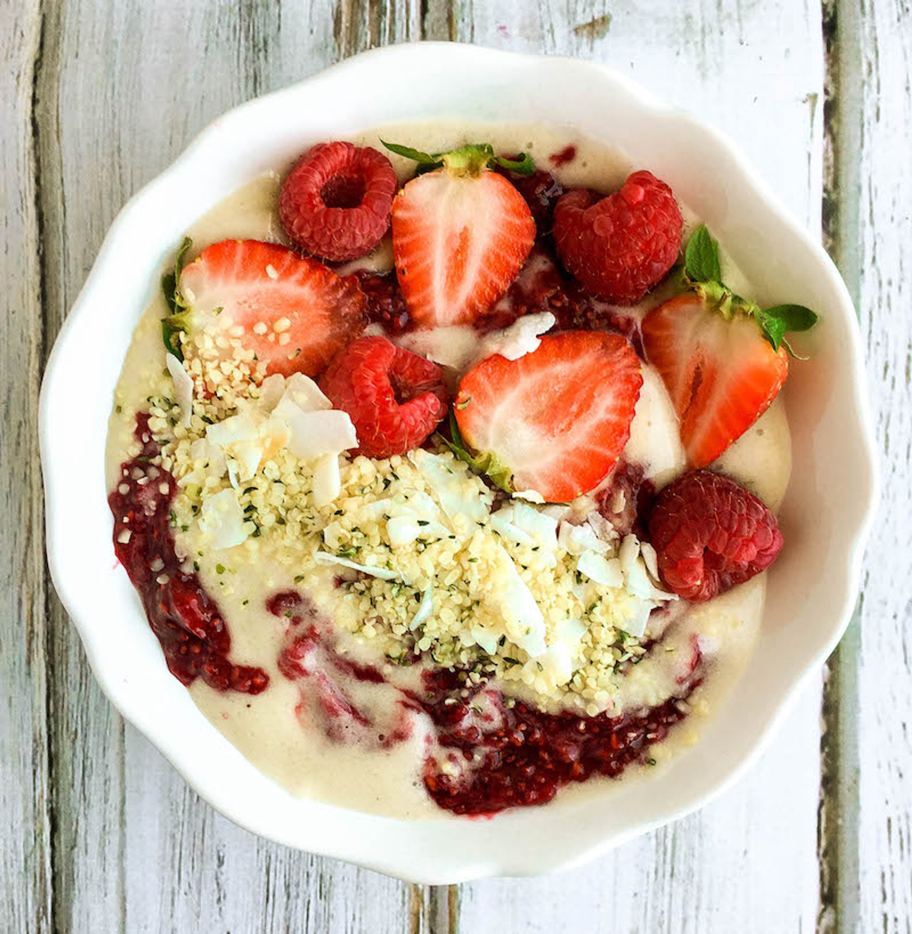 Toppings: coconut flakes, hemp hearts, flax seeds, nuts, cashew butter, etc.