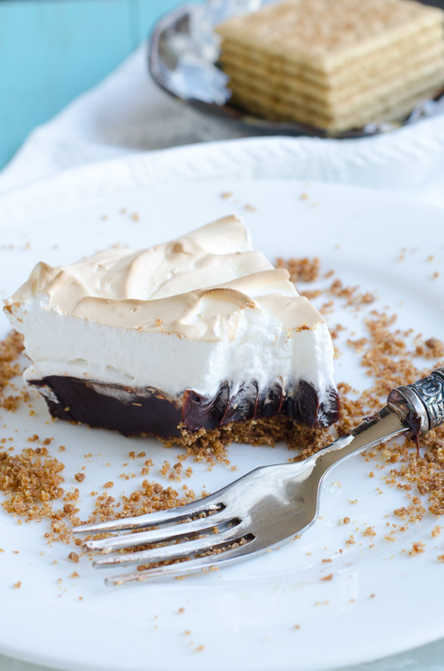 Graham cracker crust, coffee-infused chocolate ganache and a toasted meringue topping are the three magic layers to this delectable pie! You could probably charge $9 per slice for one of these pieces of heaven!