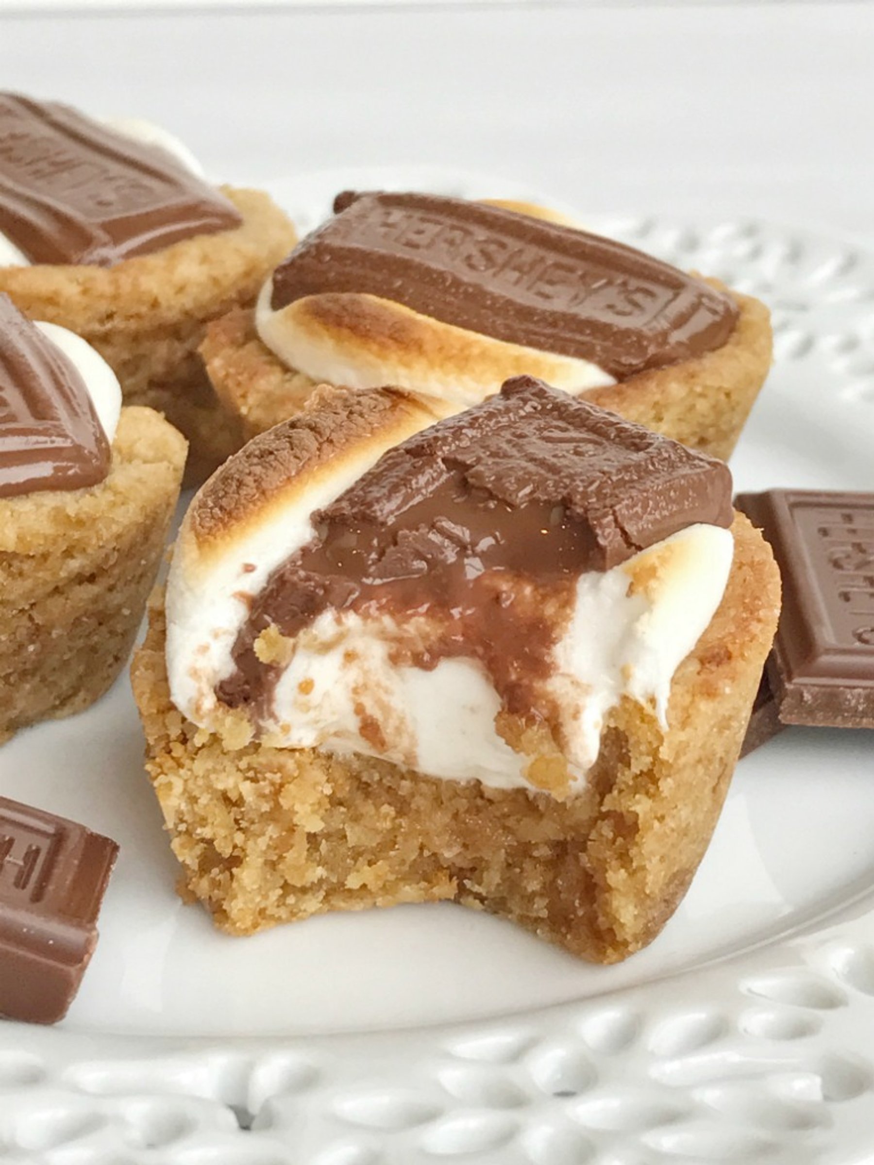 S’mores cookie cups are baked in a mini muffin pan. Graham cracker cookie base, with a toasted marshmallow, and a piece of gooey chocolate on top! Now you can enjoy campfire toasty s’more all year round for dessert.