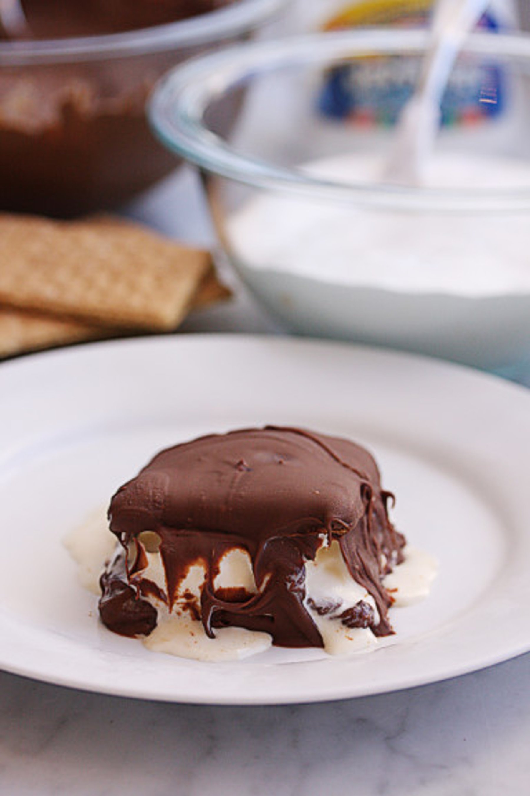 Assemble sandwiches. Break graham crackers in half to make squares. Spread marshmallow fluff on the sides...