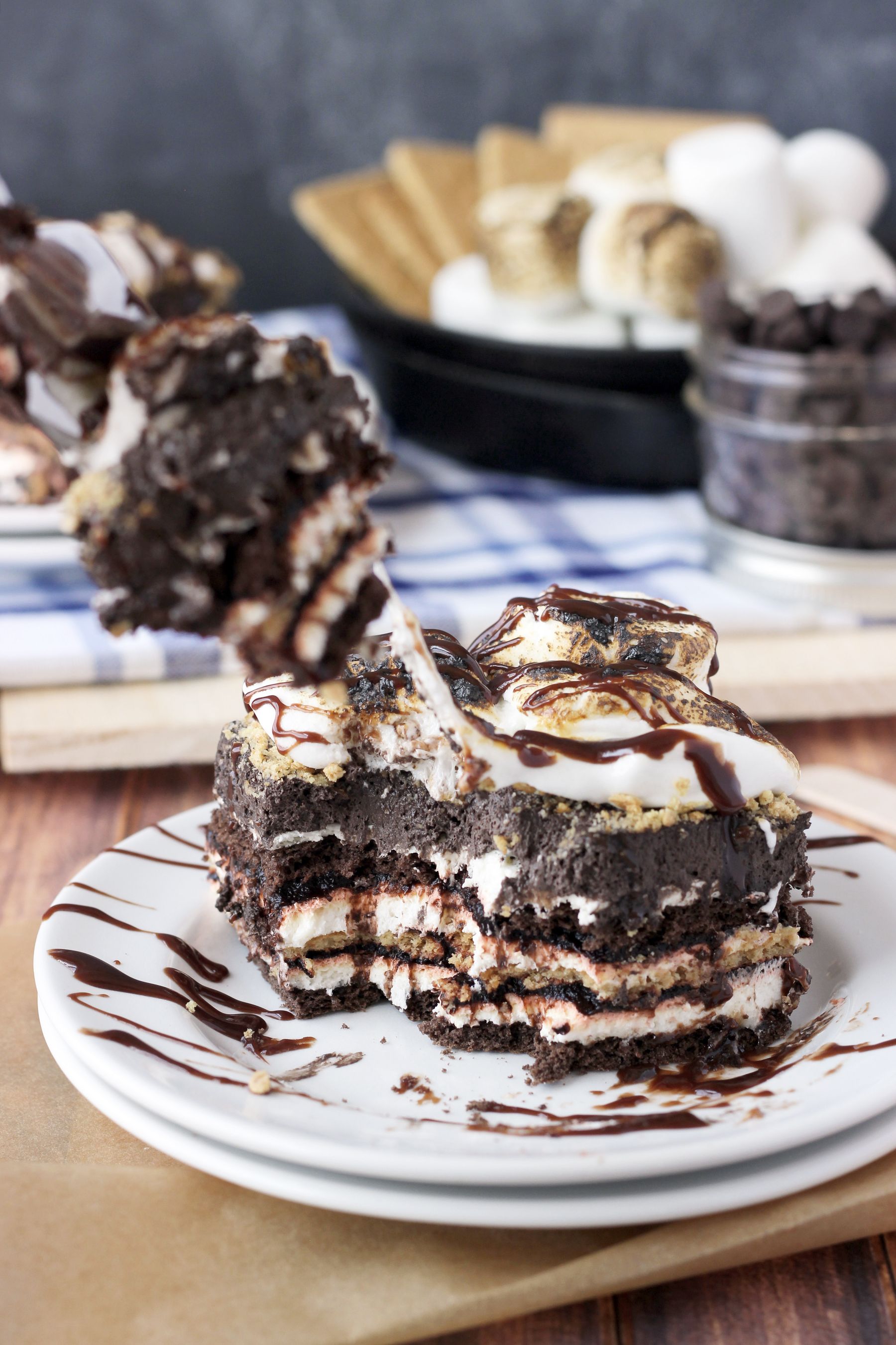 This S'mores Lasagna is layers of graham crackers, a marshmallow fluff creme & chocolate pudding. Topped with fresh chocolate whipped cream & toasted marshmallows.