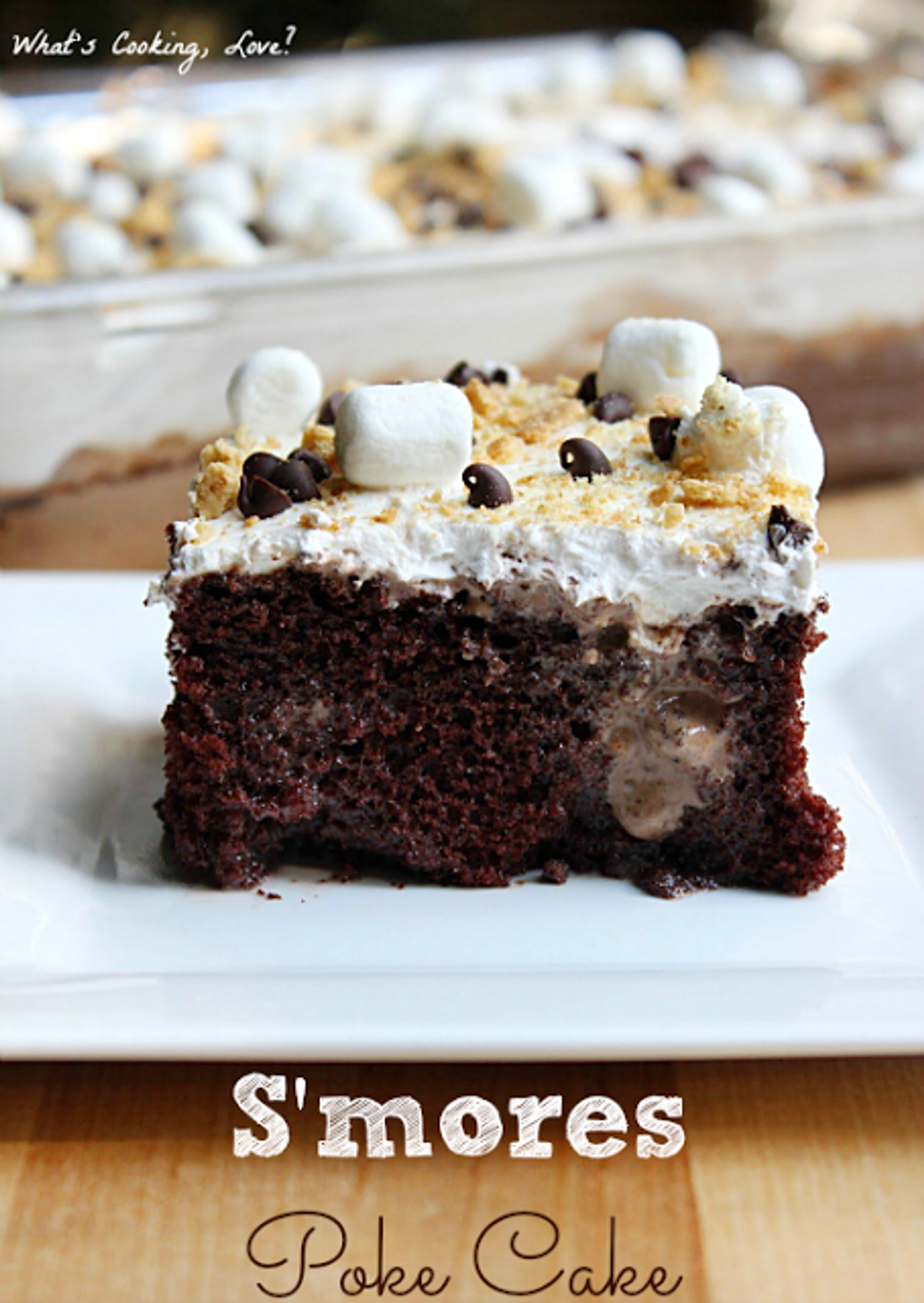 S'mores Poke Cake. An easy and delicious chocolate cake that is filled with chocolate, marshmallow, and graham cracker flavor.