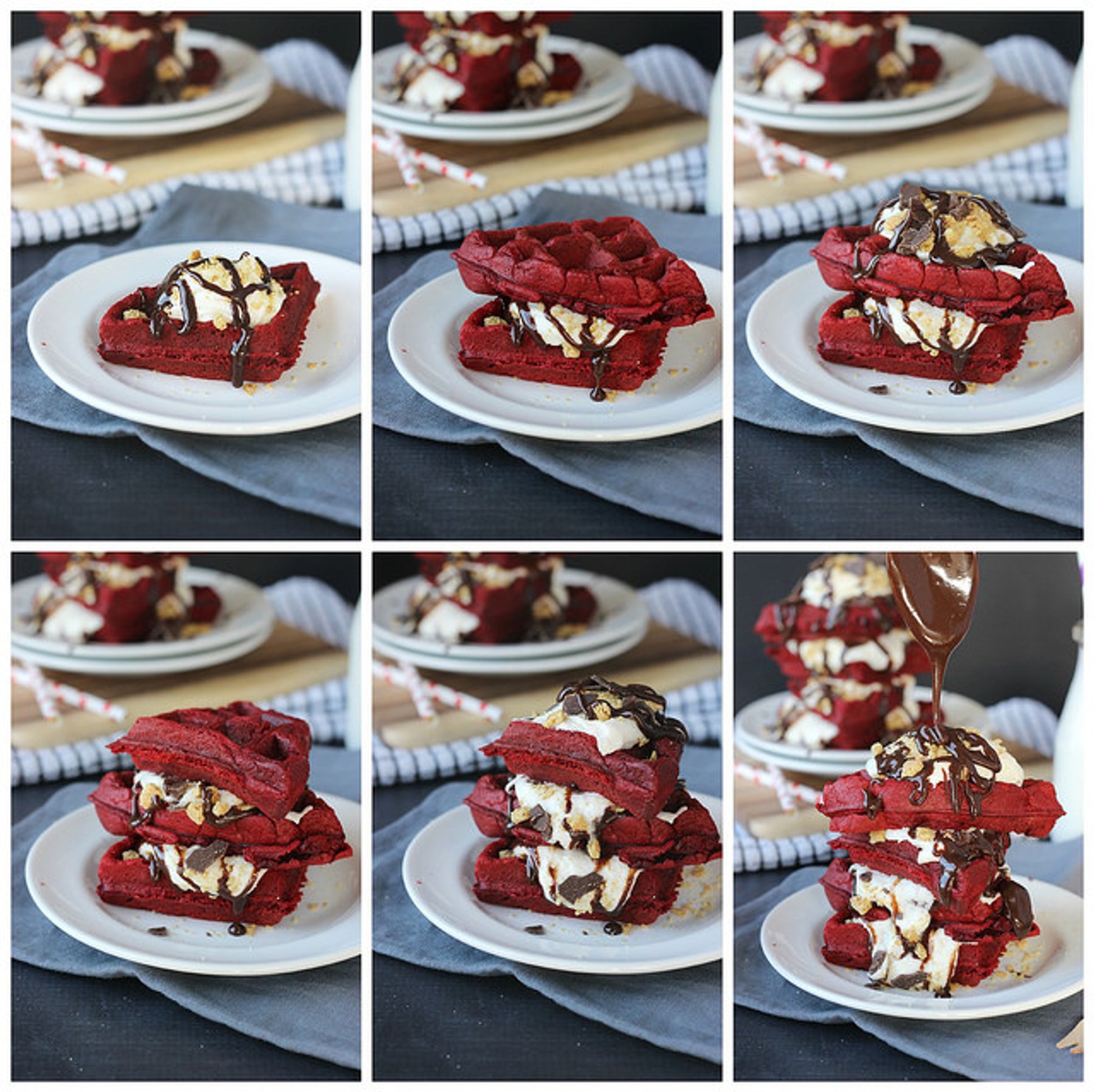 Red Velvet waffles with graham cracker, chocolate, and marshmallow goodness layers.