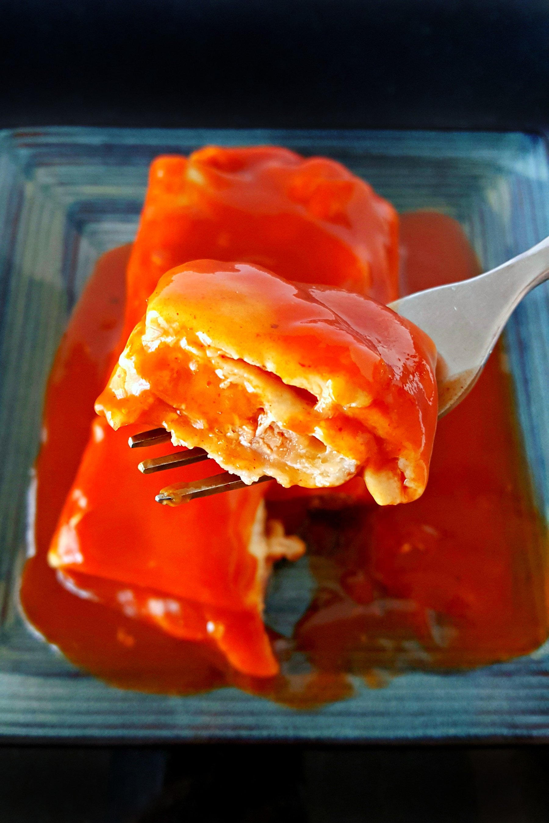 Smothered Skillet Chicken Burritos covered in red enchilada sauce, cooked in a skillet, and full of chicken, cheese, and beans cook up quickly for the busiest of weeknights.