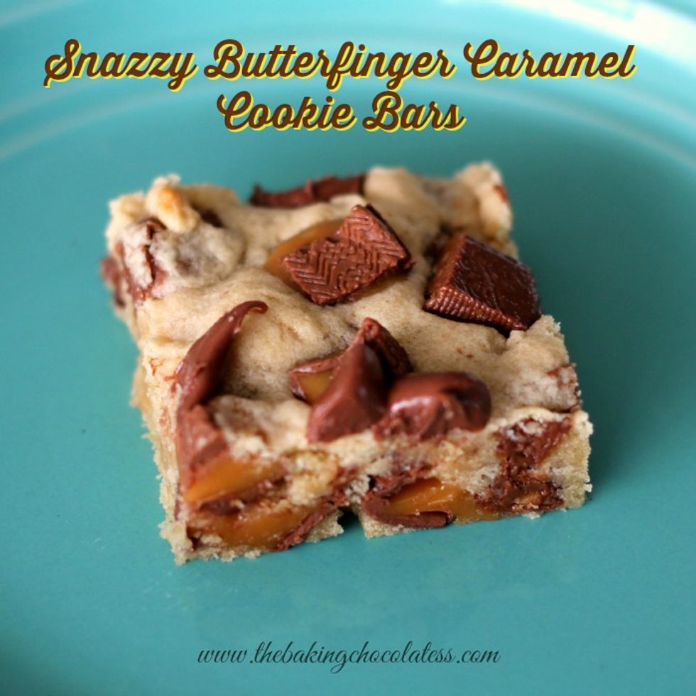 These sweet, snazzy cookie bars are jam packed with bits of creamy Butterfinger Chocolate Bar, oozing Milky Way Caramels and topped with rich milk chocolate chips.