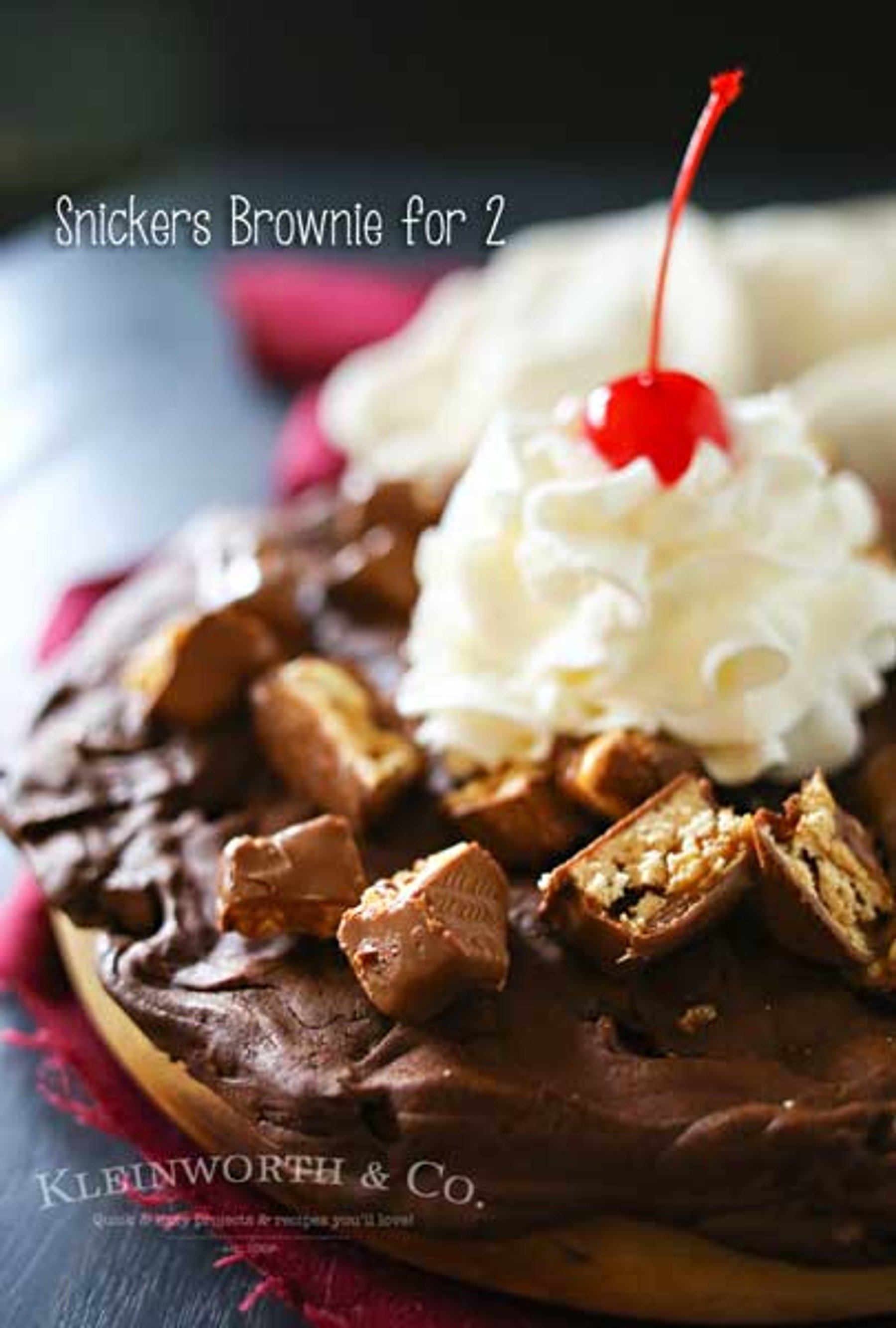 Thin brownie layer loaded with Snickers bar pieces & topped with whipped cream and cherry!