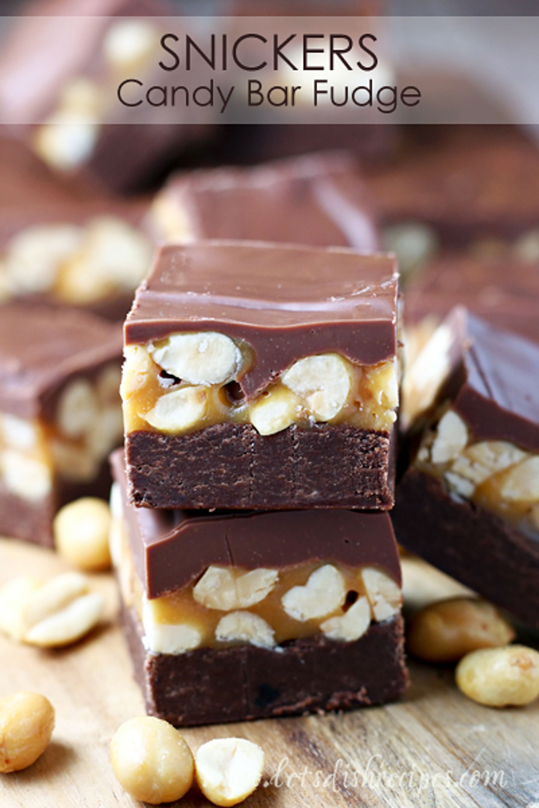 A layer of chocolate nougat, topped with peanuts and pecans, then more chocolate!