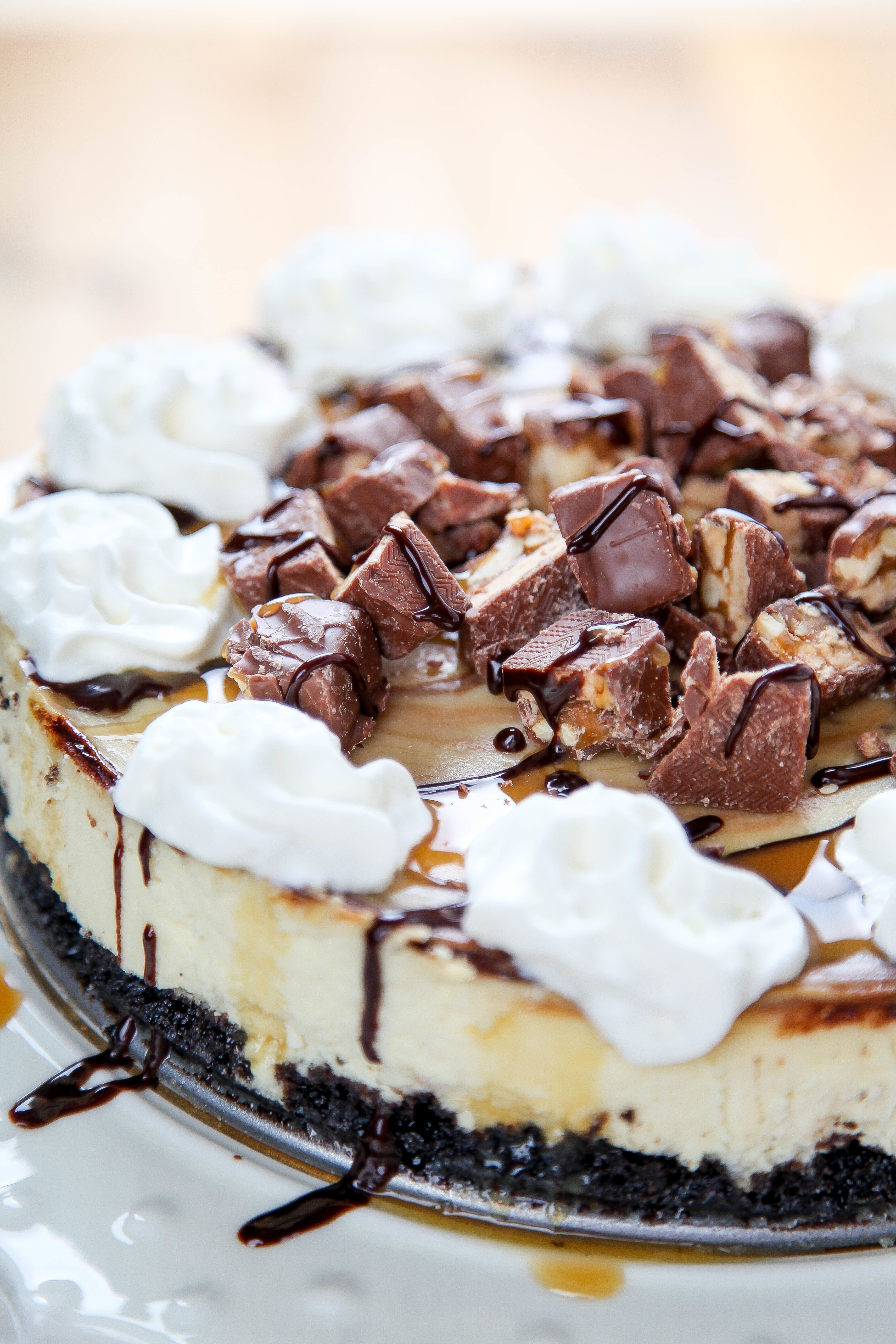 Snickers Cheesecake: Smooth creamy cheesecake with caramel, chocolate,and tons of Snickers. Your favorite candy bar in cheesecake form!