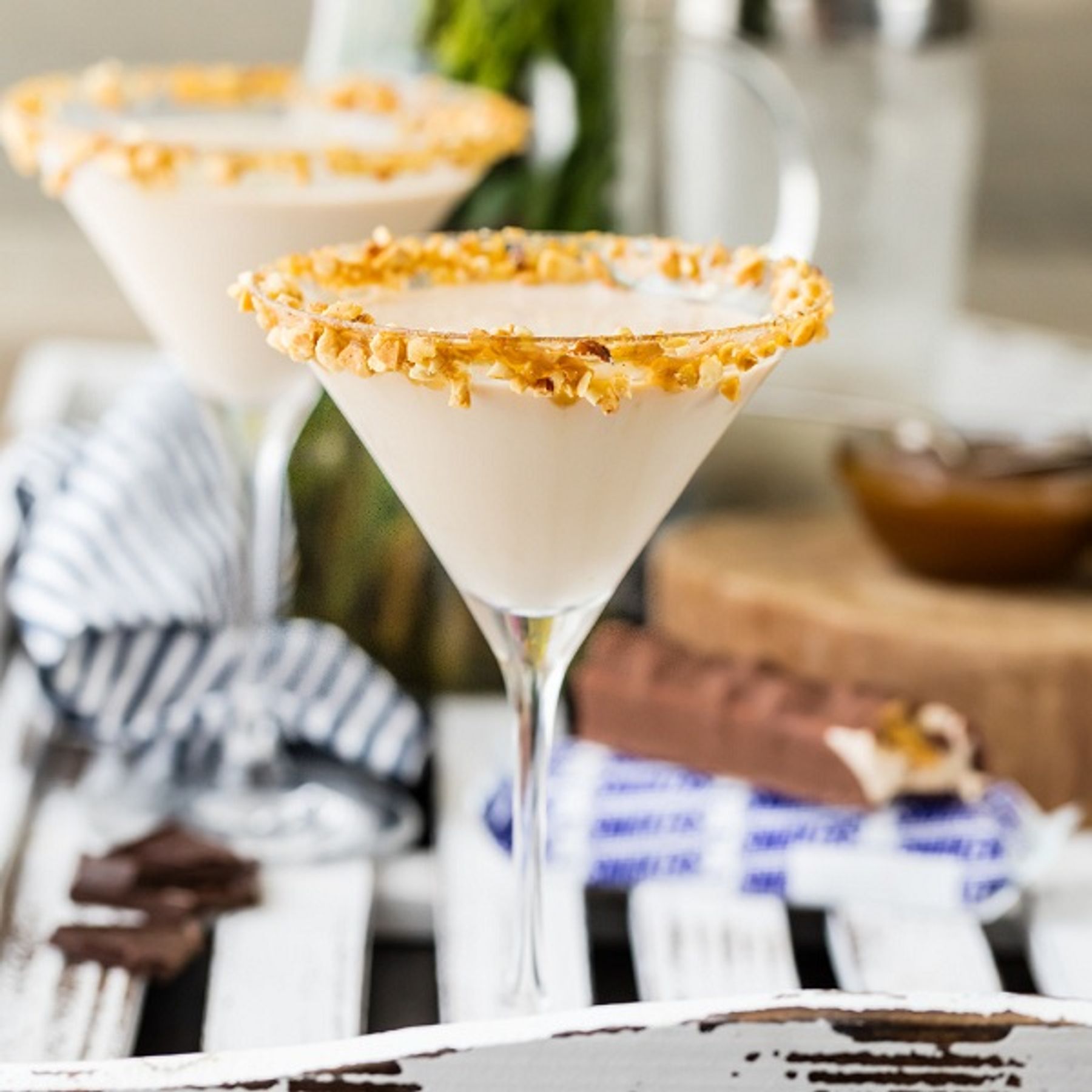 1. Dip rim of martini glass in caramel sauce then roll in chopped peanuts. Place in fridge for about 5-10 minutes to set the rim. (the caramel sauce might drip if not set...this is an optional step)