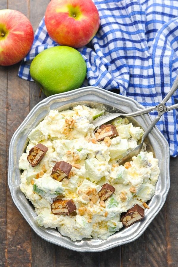 A salad that's named after a candy bar?! YES! This fresh apple and Snickers Salad is an easy dessert recipe or sweet side dish for your next potluck party or holiday gathering! The classic combination of juicy apples, creamy caramel and crunchy peanuts is undeniably delicious.