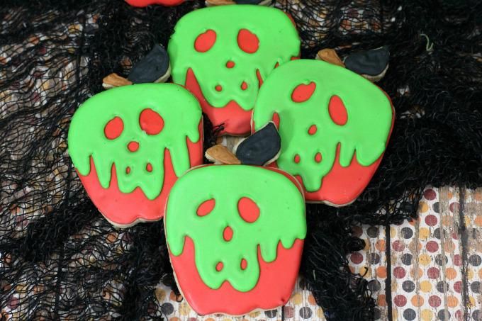 These delicious sugar cookies are topped with royal icing that gives the look of an apple covered in green poison.