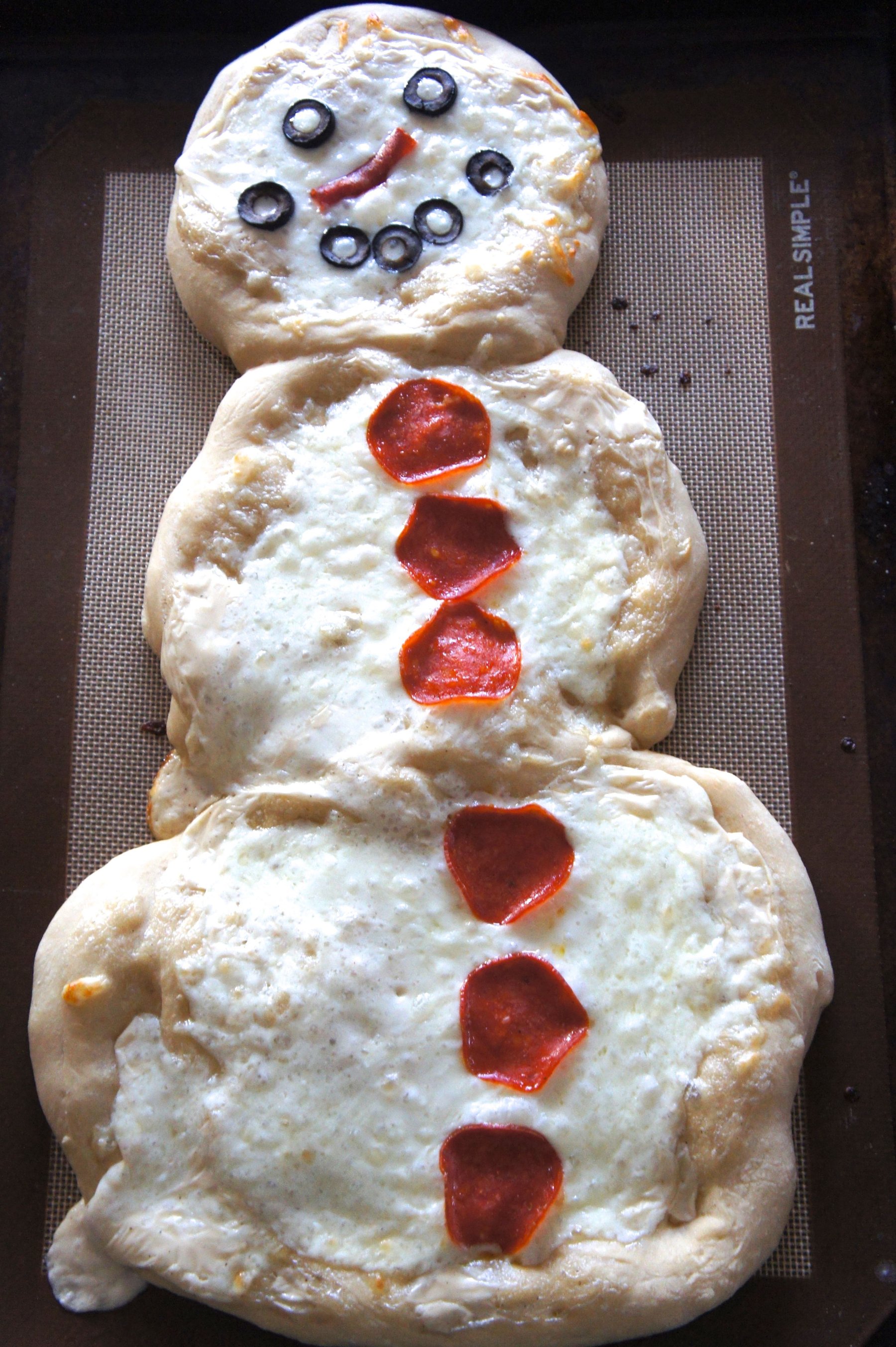 Pizza in the shape of a snowman is a fun way to enjoy pizza.