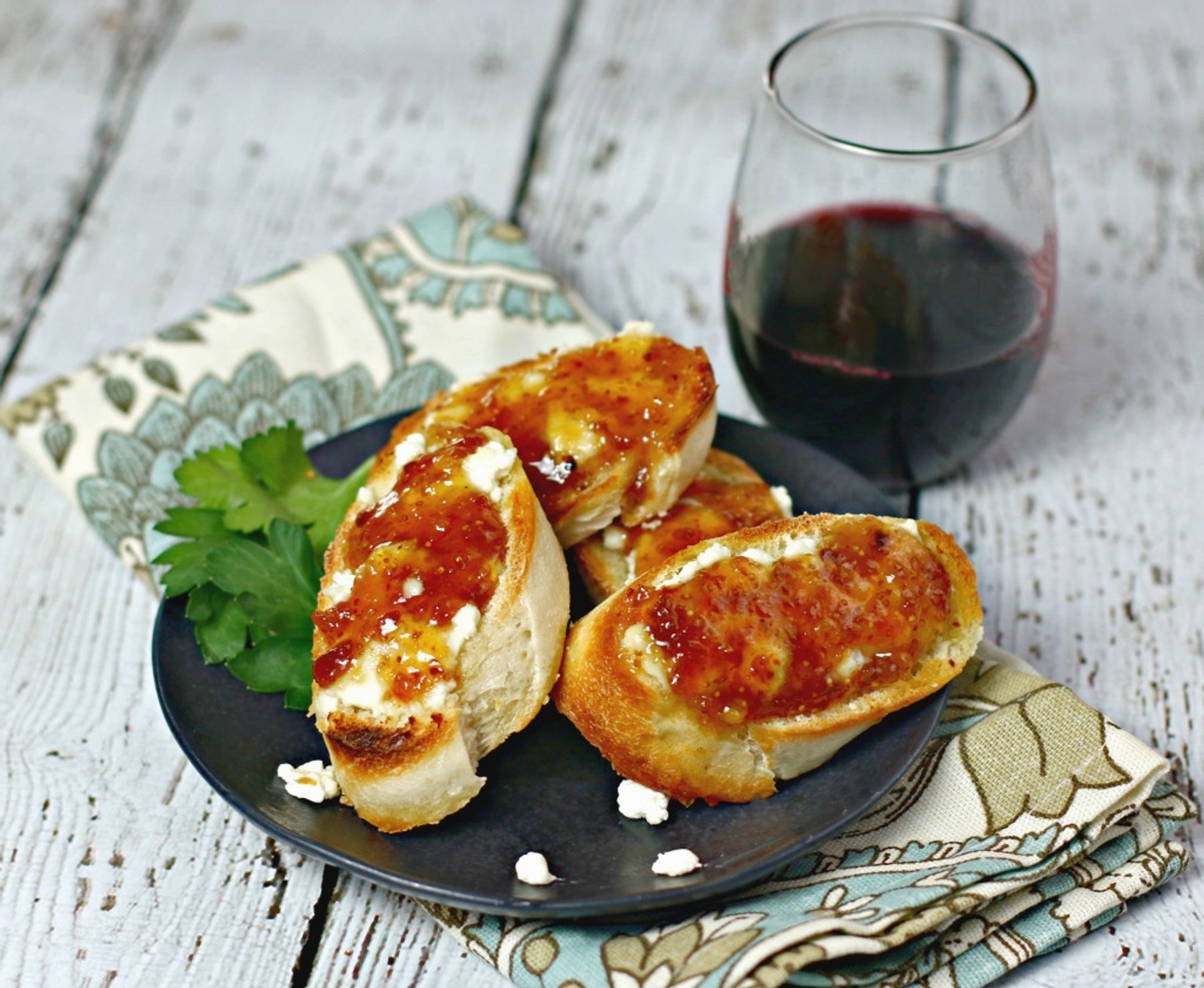 Top each bread slice with 1½ teaspoons goat cheese and 1½ teaspoons fig spread. Arrange bruschetta on a baking sheet. Broil 2 minutes or until jam begins to bubble. Serve warm.