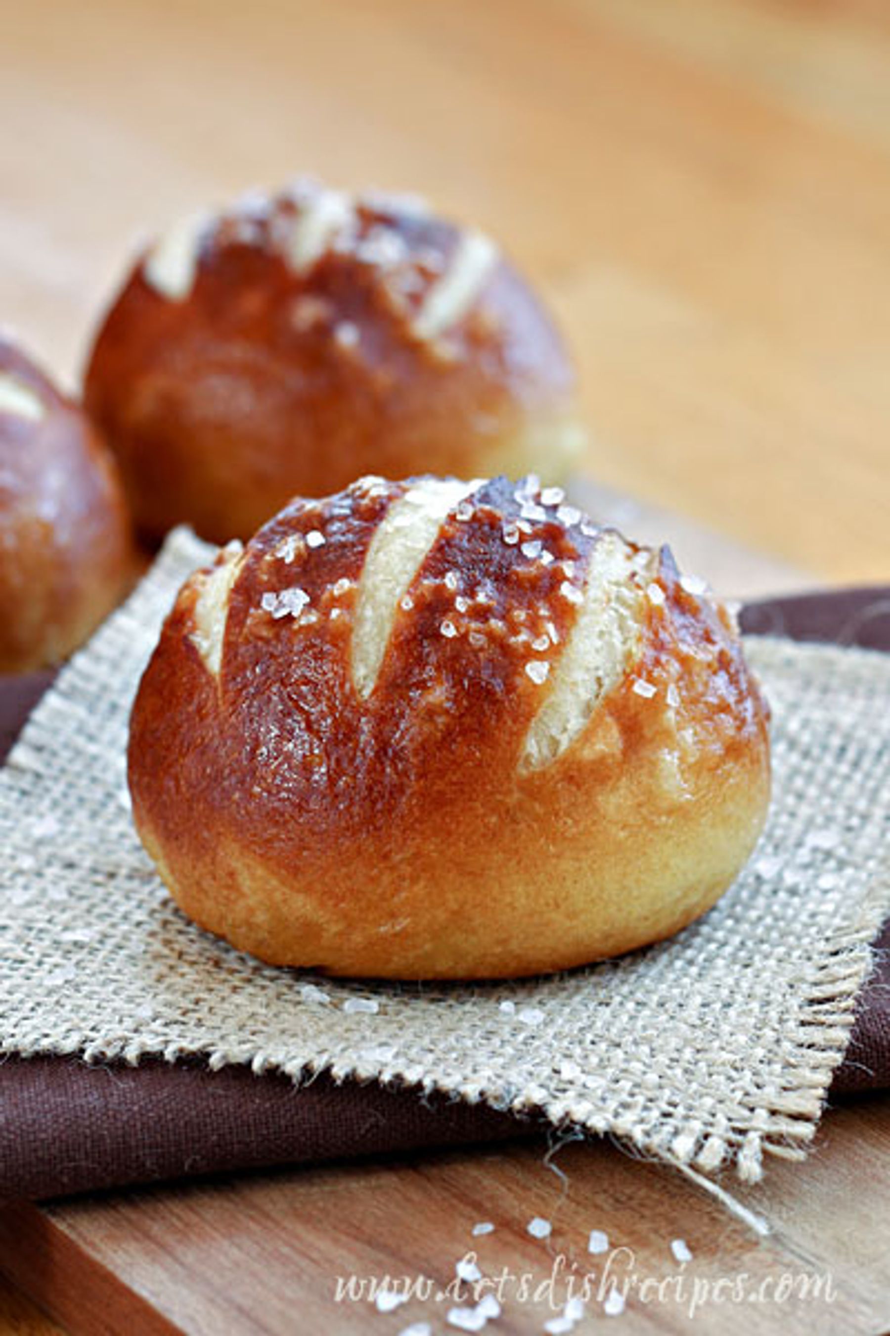 Pretzel rolls with a soft inside, a chewy outside, and light coating of sea salt.
