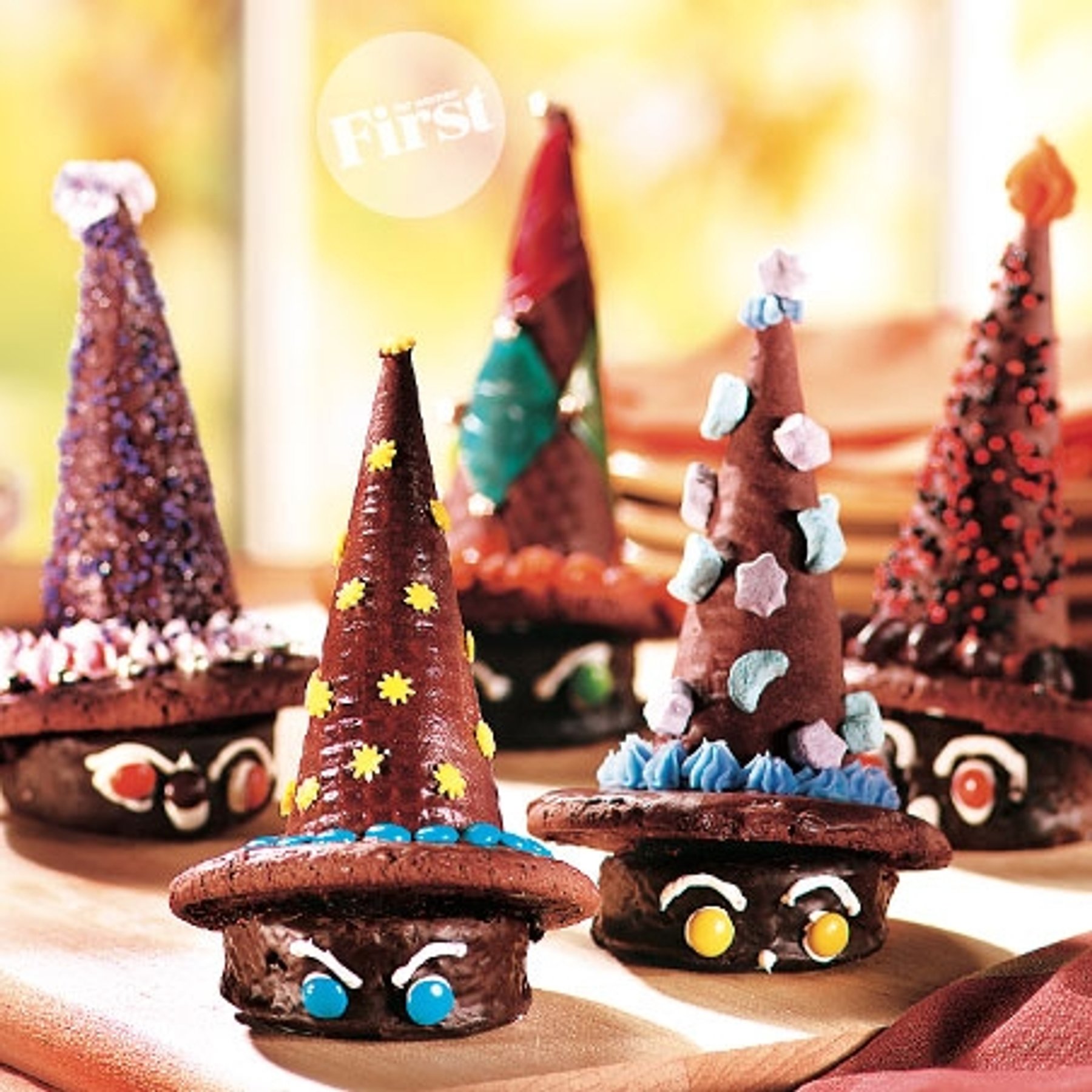 These spell-casting treats start with store-bought snack cakes and get their perfect pointy hats from ice-cream cones dipped in chocolate frosting that are then attached to cookies.
