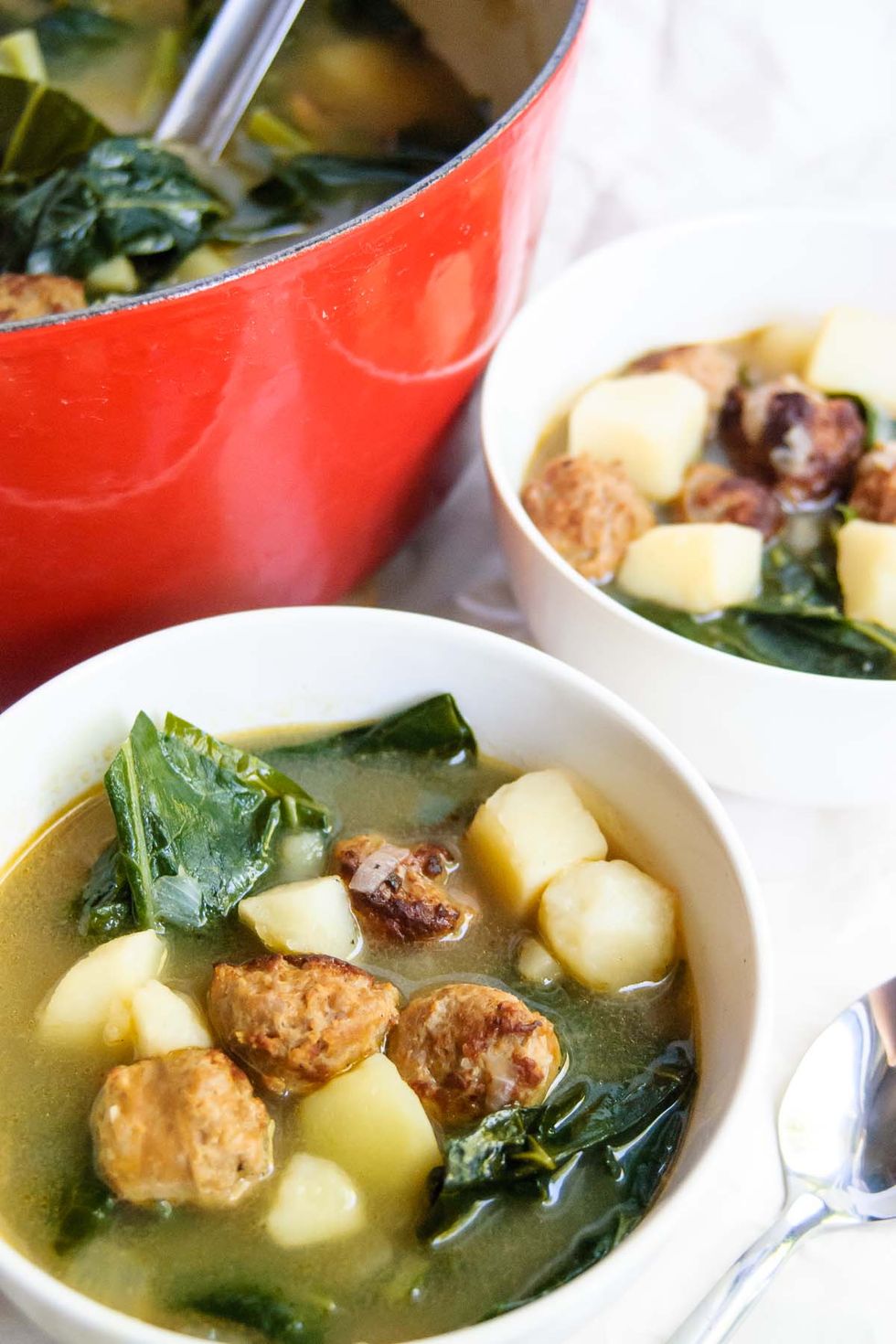 Hearty sausages, potatoes and collard greens are here to fill you up and warm your soul in this Portuguese Caldo Verde Soup! One pot, easy to make and great as leftovers for the week!