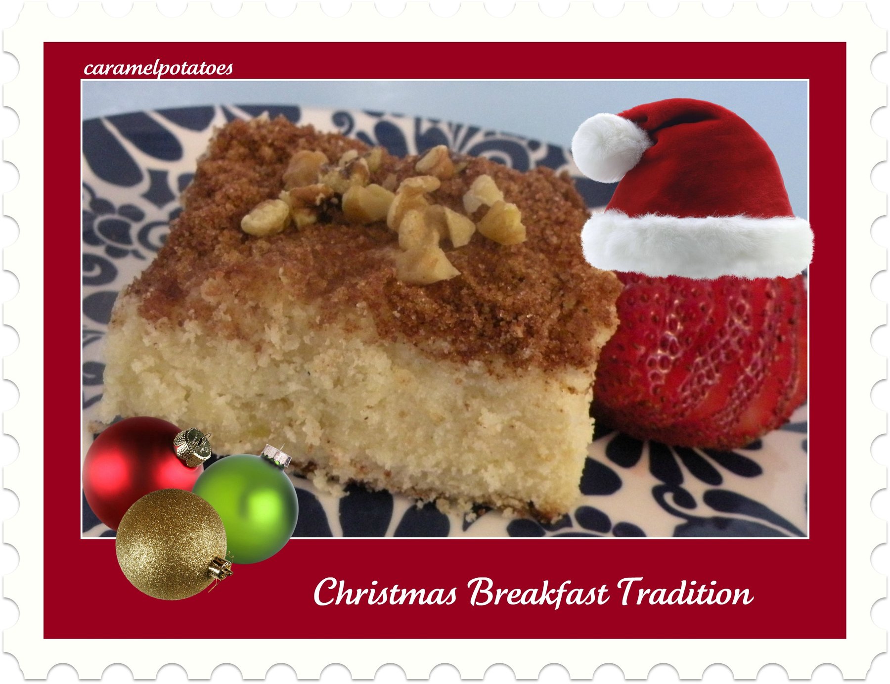 We love this cake {for Christmas and for any excuse we can think of!}. The sour cream and apples combine to make it so moist it just melts in your mouth! I love it for Christmas because I can make it up a couple of days before for a no-hassle Christmas morning ! {Make sure to hide it so it doesn’t get eaten before Christmas}