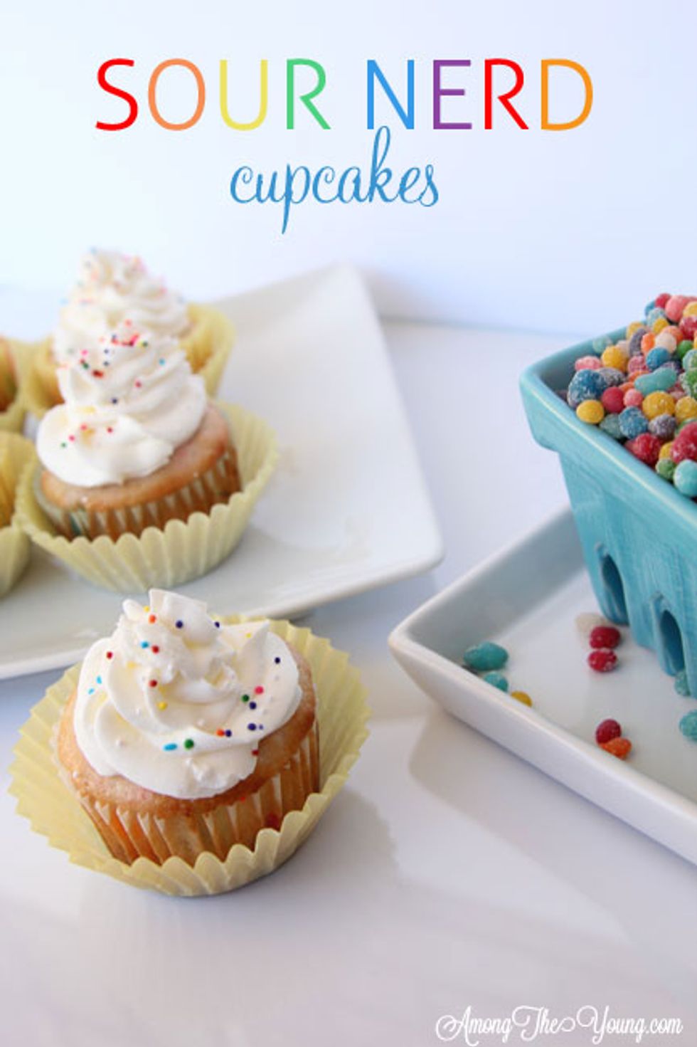 Prepare cake mix as directed. Once it is well blended, gently fold in the sour nerds. Bake as directed on the box mix. Cool completely and frost.