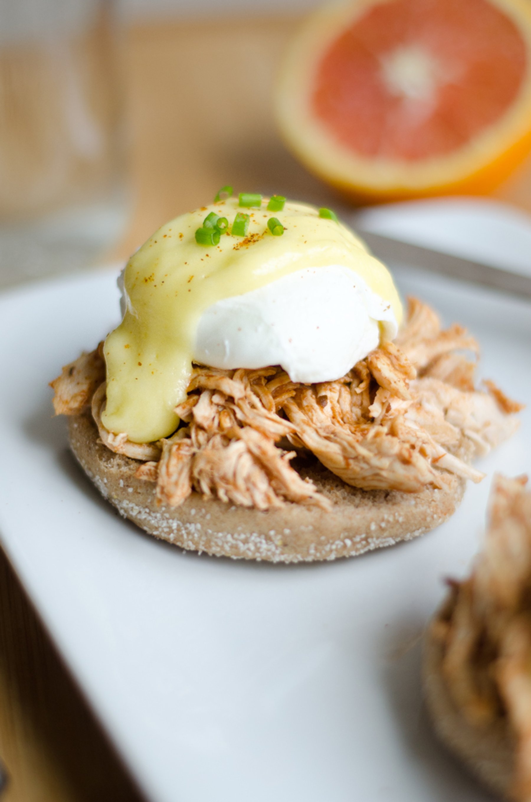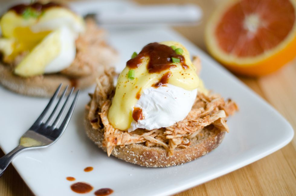 Fresh hollandaise atop a poached egg and shredded BBQ chicken.