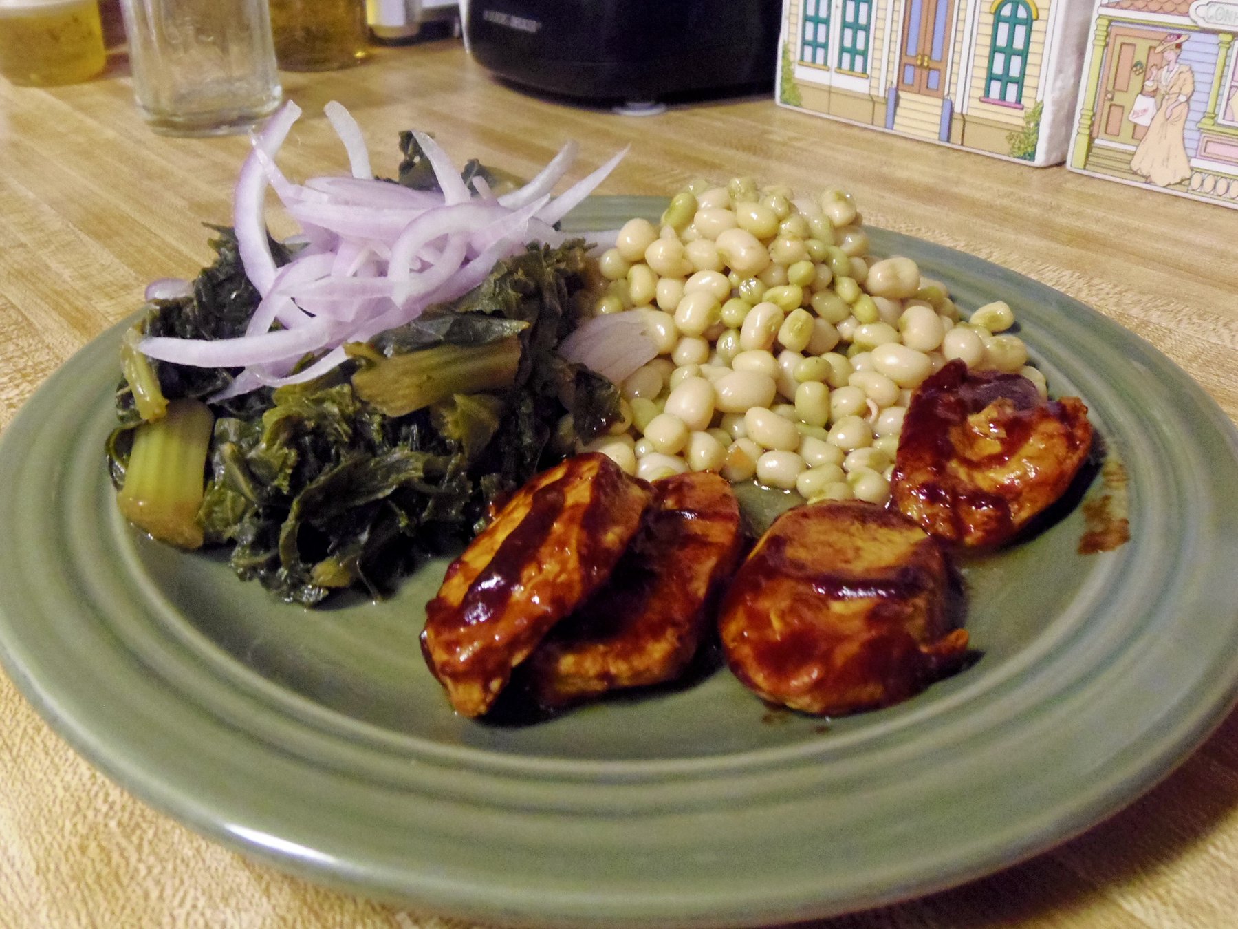We love a big pot of greens served with hot pepper sauce and onions. Usually when we eat greens we also have some kind of peas (with hot chow-chow) and a protein. We love Gardein products and they have so many varieties to choose from. This dinner was a mustard greens and turnip greens mix, zipper peas and Gardein wings. UMMMMM....