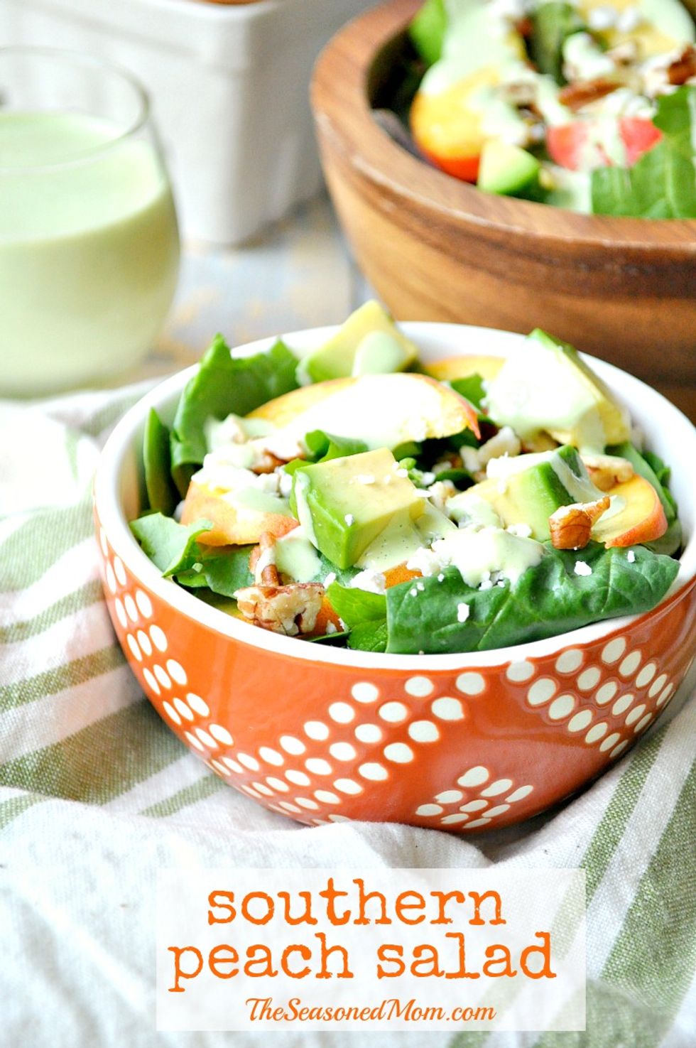 My Southern Peach Salad with Green Goddess Dressing is the salad of the summer! This fresh mixture is bursting with flavor and a variety of textures, thanks to the sweet and juicy peaches, crunchy pecans, tangy blue cheese, and creamy avocado. Top it all off with a easy fresh herb dressing, and you’ll never want another mediocre iceberg wedge again!